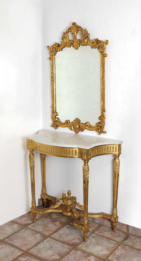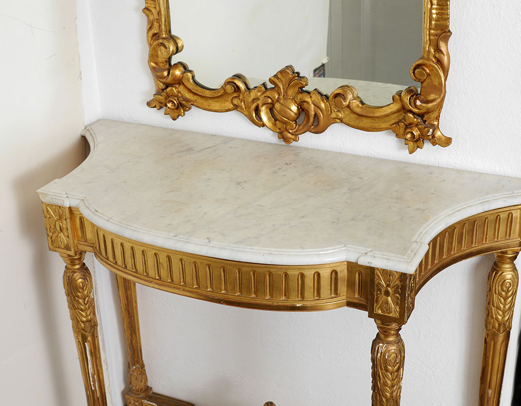 ROCOCO CARVED GILT WOOD CONSOLE TABLE & MIRROR: Continental rococo style gilt wood table, shaped white marble top, fluted skirt, floral medallions at joints, fluted legs with acanthus leaves, shaped stretcher with center urn finial, 36 1/4'' h. x 40 1/2'' x 19''. Wall mirror with foliate scroll motif, 43 1/2'' x 29''.