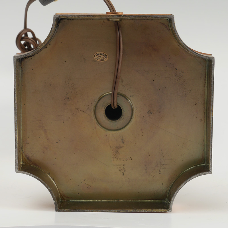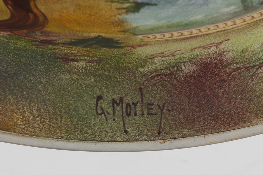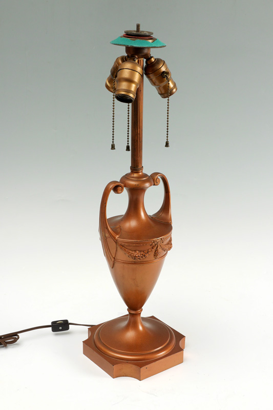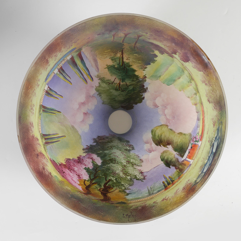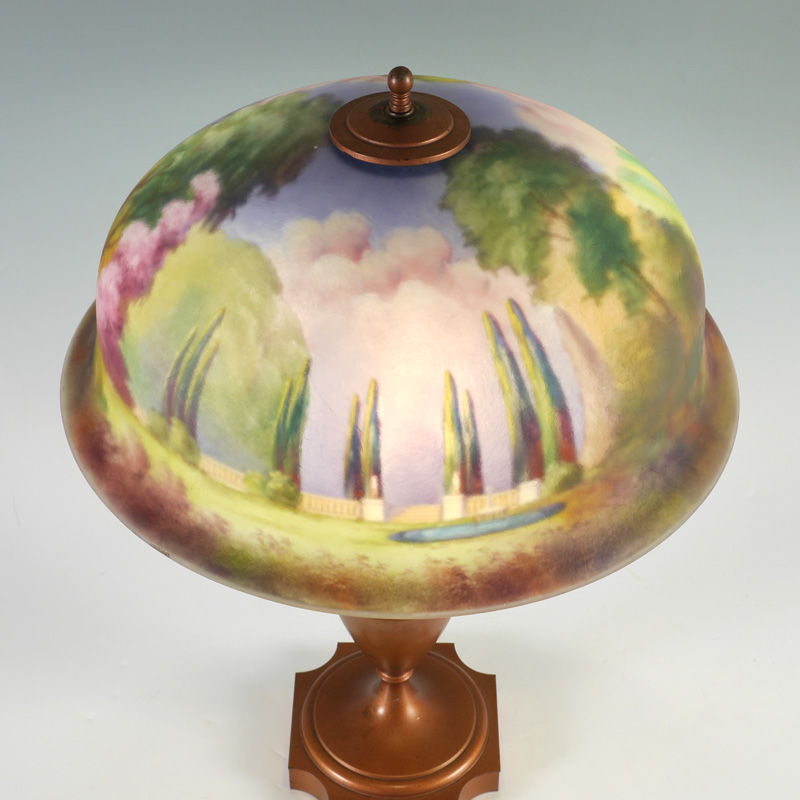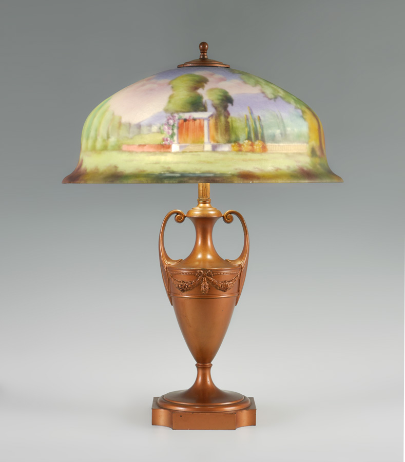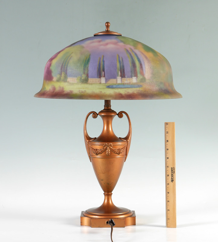 G. MORLEY SCENIC REVERSE PAINTED PAIRPOINT LAMP: Painted and lacquered urn form lamp base marked Pairpoint, D 3015 1/2, 3 socket fixture, 24 1/4'' h. x 6 3/4''. Reverse painted Italian garden landscape motif molded and textured shade, signed G. Morley, 7 1/2'' h. x 18'', fitter rim 2 1/2''.