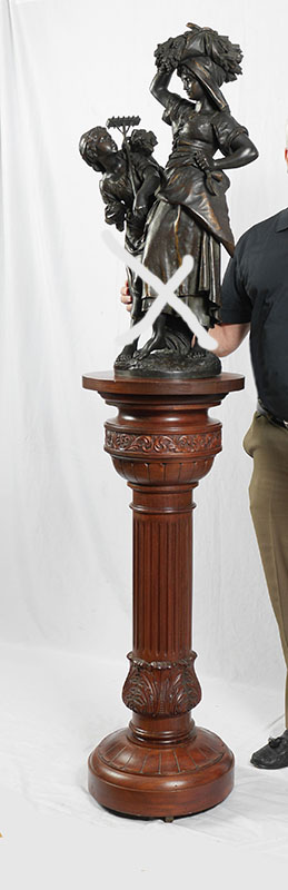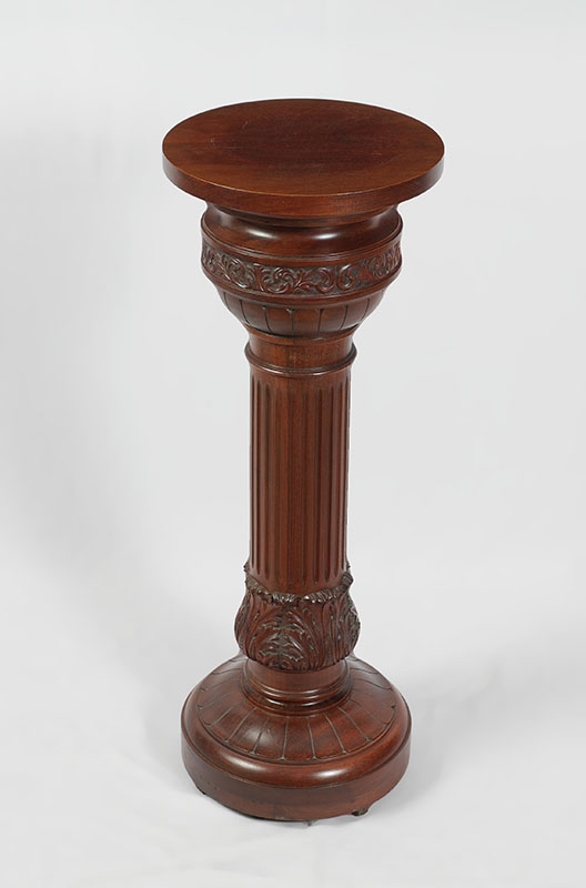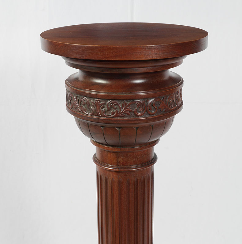 VICTORIAN CARVED MAHOGANY PEDESTAL: Round top over foliate scroll motif band, fluted column over carved acanthus leaves, flared base. Overall 43'' h. x 16''.