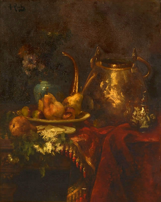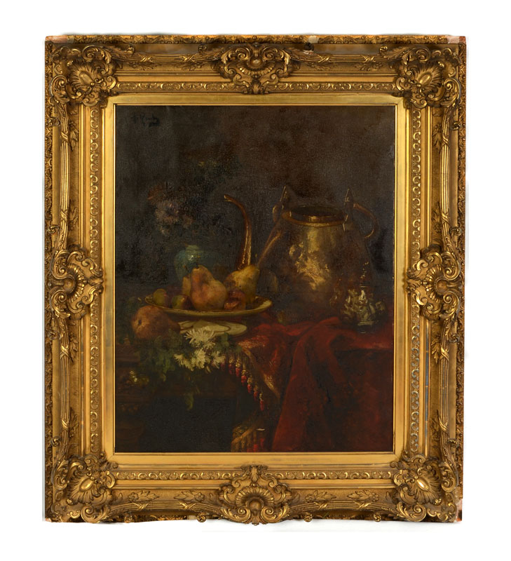 ROUBY, Alfred, (French, 1849-1909): Still Life with Vessels, Fruit and Flowers, Oil/Canvas, 32'' x 26'', signed upper left and encased in elaborate gilded gesso frame, 44'' x 38''.