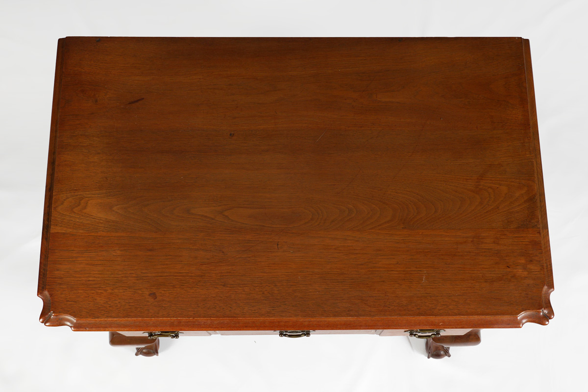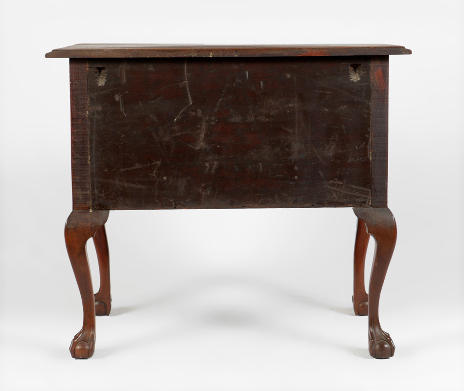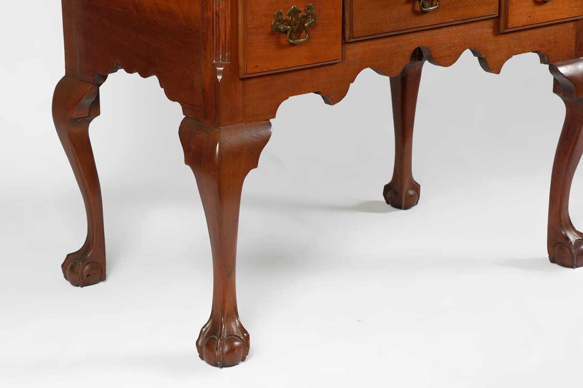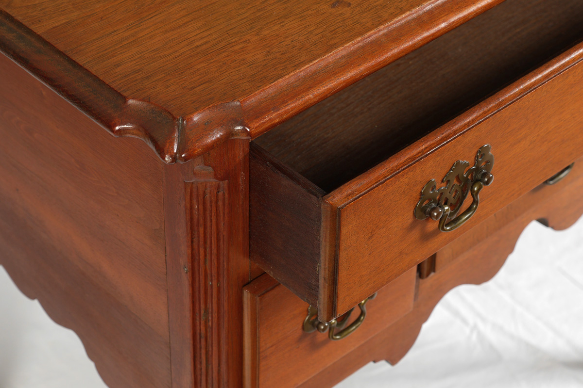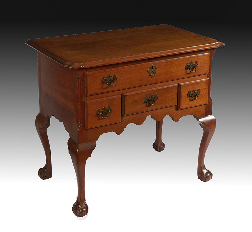 19TH CENTURY CHERRY QUEEN ANNE LOWBOY: Top with shaped front corners, single full-length drawers over 3 drawers, brass batwing pulls. Scalloped skirt, Queen Anne legs with claw and ball feet, 28 3/4'' h. x 32 1/2'' x 20''.