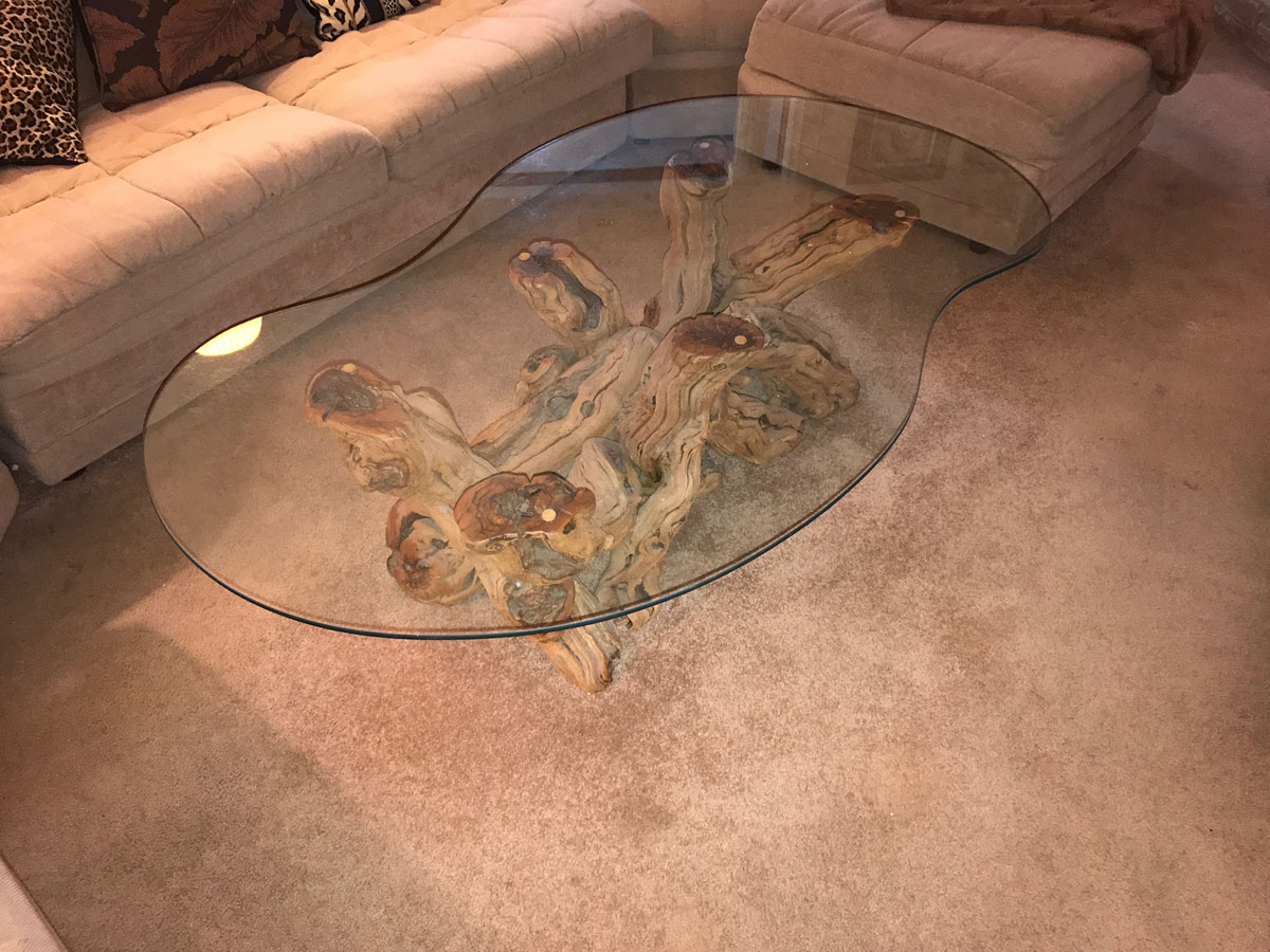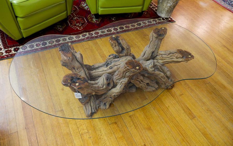 GRAPEVINE GLASS TOP COFFEE TABLE: Based constructed from retired California grapevines, measures 15 1/2'' h. x 40'' x 18'', shaped glass top 60'' x 33''.