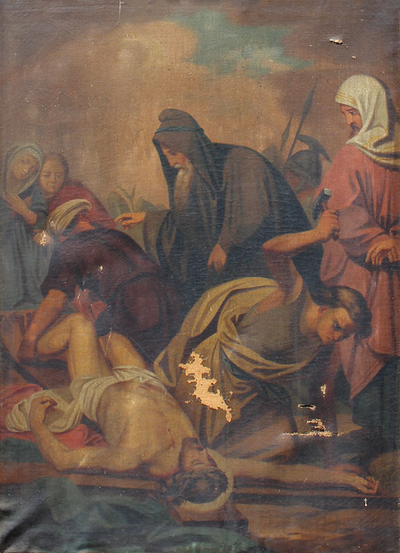 19th CENTURY PAINTING OF CHRIST ON THE CROSS: Oil on Canvas, 35'' x 25.25'', no visible signature, framed, 43.5'' x 33.5''.