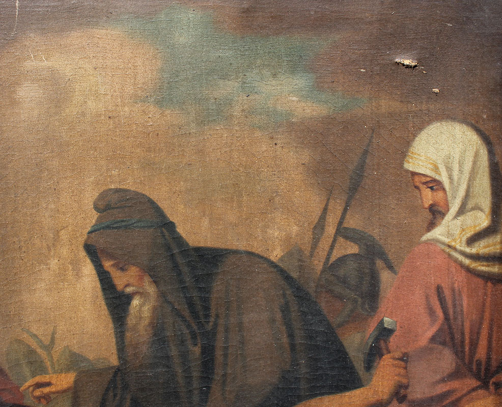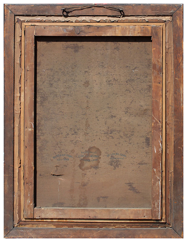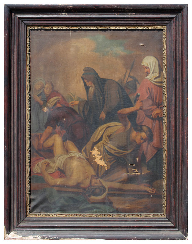 CONDITION: Scattered paint loss, several abrasions, needs cleaning, several punctures in lower and upper right corners, frame shows wear, sold as is.