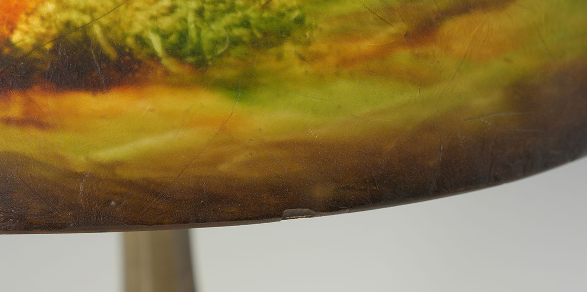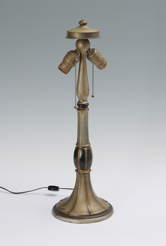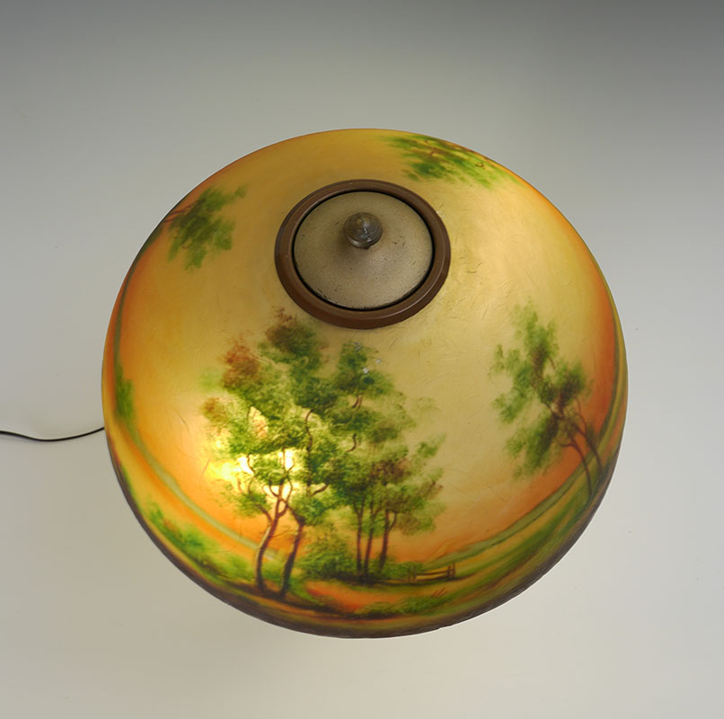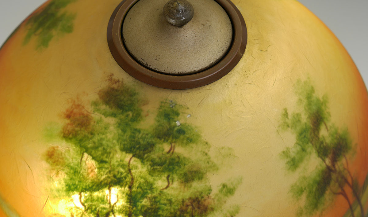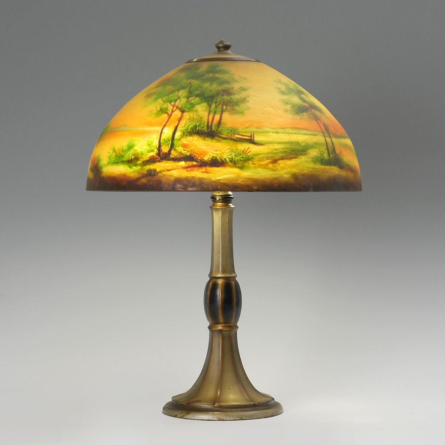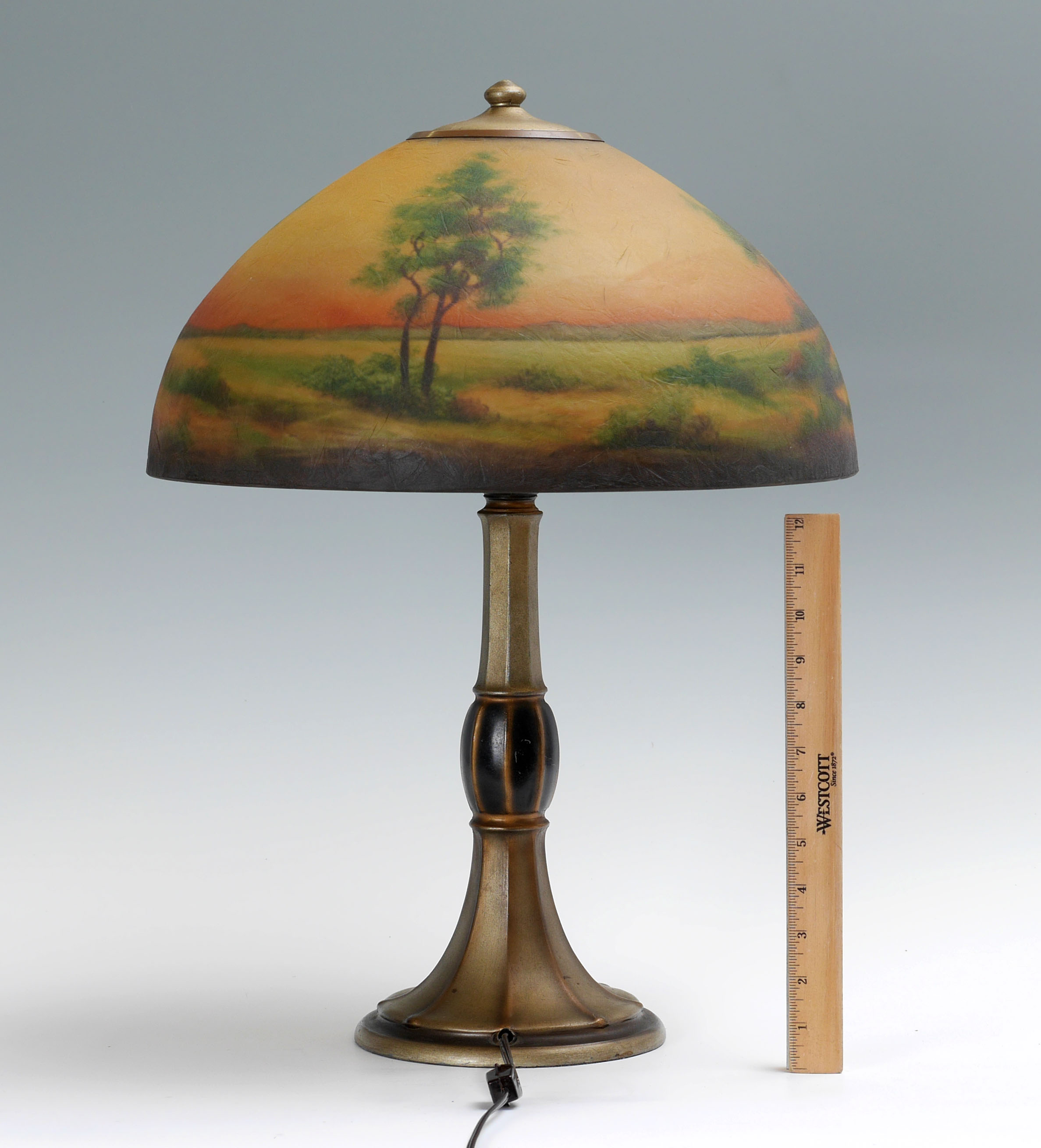 JEFFERSON REVERSE PAINTED SHADE LAMP: Unsigned painted cast metal base with double socket fixture, 22'' h. x 7''. Molded and textured reverse painted shade with pastoral landscape, marked Jefferson on top fitter ring, 7 3/4'' h. x 16''.