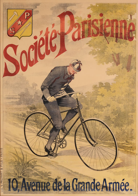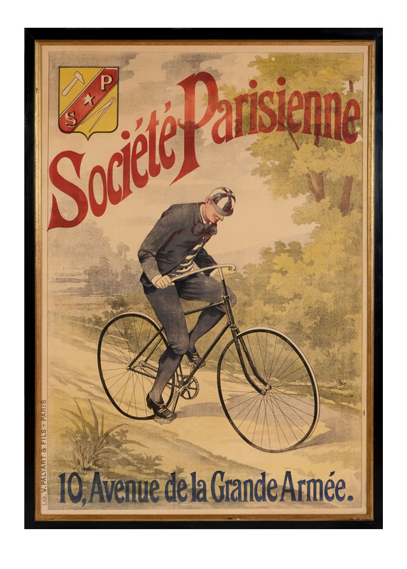 1895 SOCIETE PARISIENNE BICYCLE POSTER: Lithograph advertising poster for Societe Parisienne featuring a man on a bicycle and address 10, Avenue de la Grand Armee, printed by V. Palyart & Fils - Paris, circa 1895. Sight size 50 1/2'' x 35 1/2'', framed 54 1/4'' x 39 1/4''.