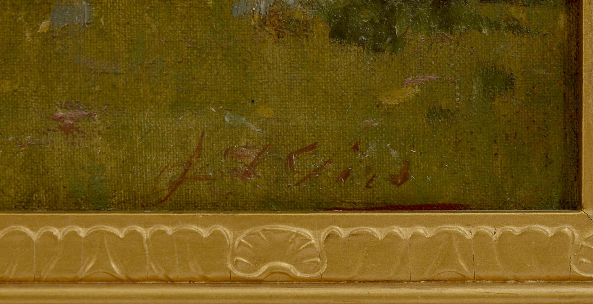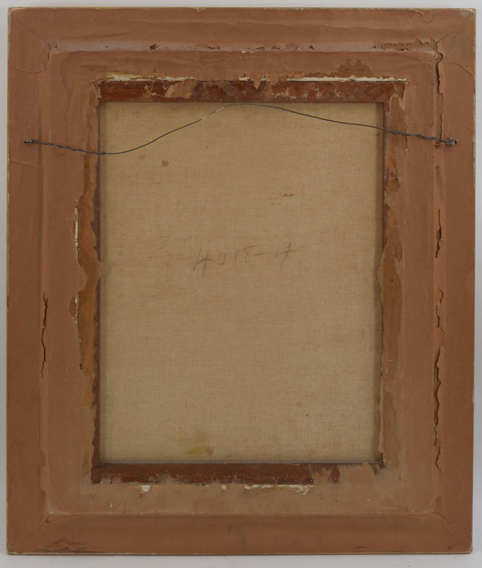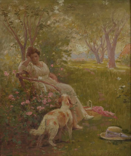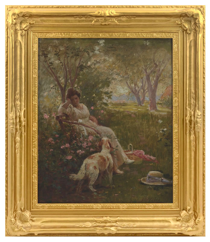 GOOD IMPRESSIONIST PAINTING OF WOMAN AND DOG: Oil/Canvas, 17'' x 14'', scene depicts a young woman seated in a shady outdoor setting, with her faithful dog near her feet, carved gesso frame, 23'' x 22'', possibly a Hungarian artist, this is illegibly signed lower right, circa 1930.