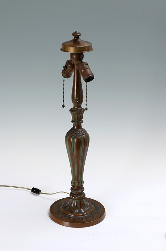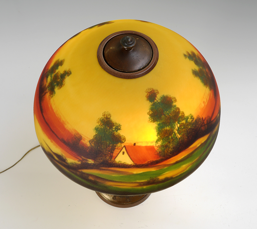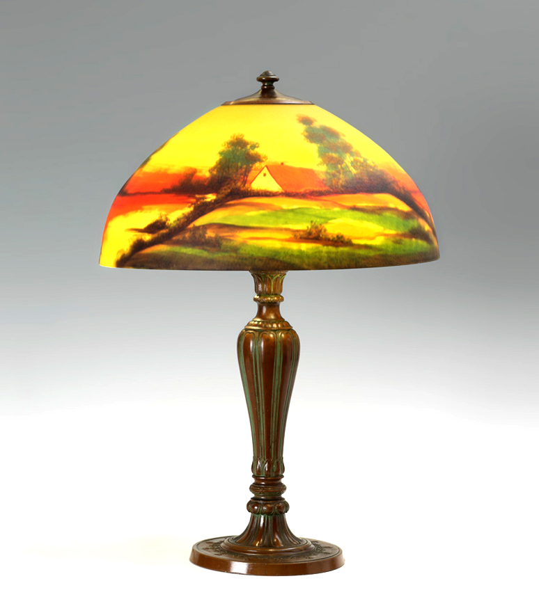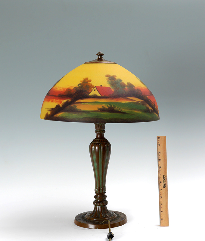 JEFFERSON REVERSE PAINTED SHADE LAMP: Unsigned patinated cast bronze base with double socket fixture, 22'' h. x 7''. Molded and textured reverse painted shade with house by lake landscape scene, marked Jefferson on top fitter ring, 7 3/4'' h. x 16 1/4''.