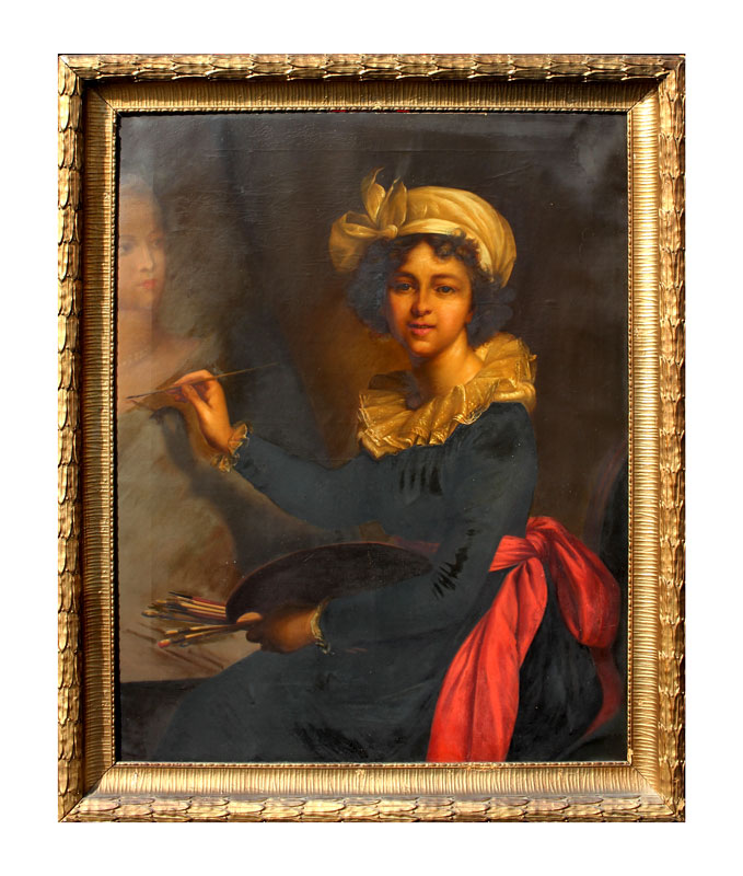 LARGE PORTRAIT PAINTING AFTER LEBRUN BY LEBRUN: Oil/Canvas, Depicts Vigee Lebrun portrait of herself, late 19th early 20th century reproduction, 40'' x 31.5'', acanthus leaf gesso frame, 46.5'' x 37.5''.