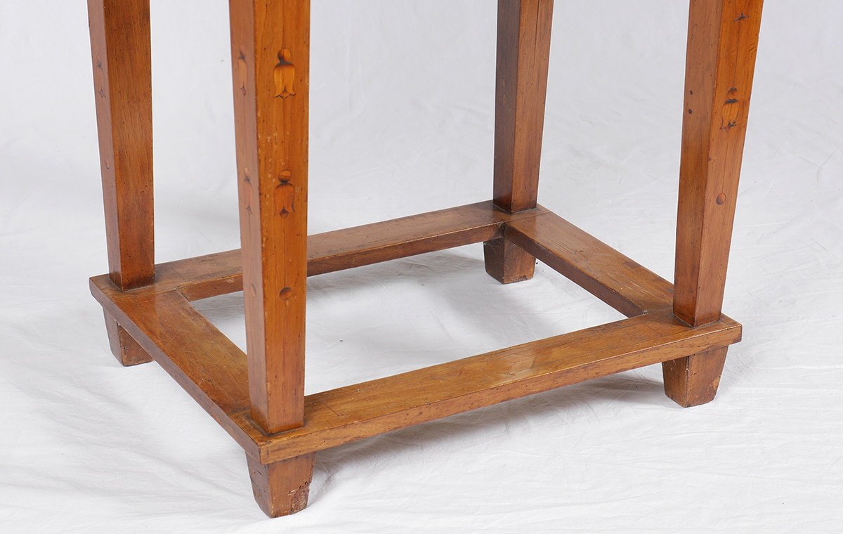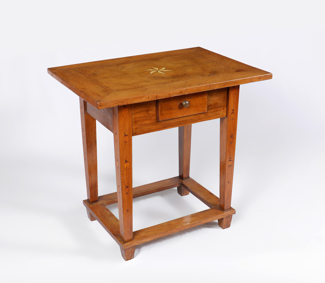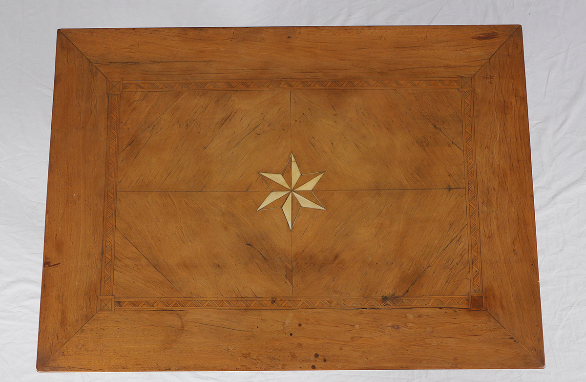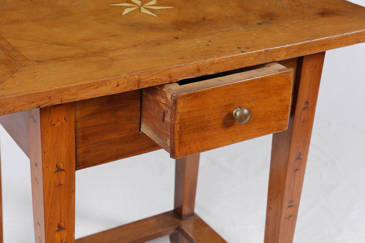PARQUETRY INLAID SINGLE DRAWER SIDE TABLE: Continental side table with inlaid star center and woven border, skirt with single small drawers. Square legs with bellflowers, lower stretchers, overall measures 29 1/2'' h. x 31'' x 22 1/4''.