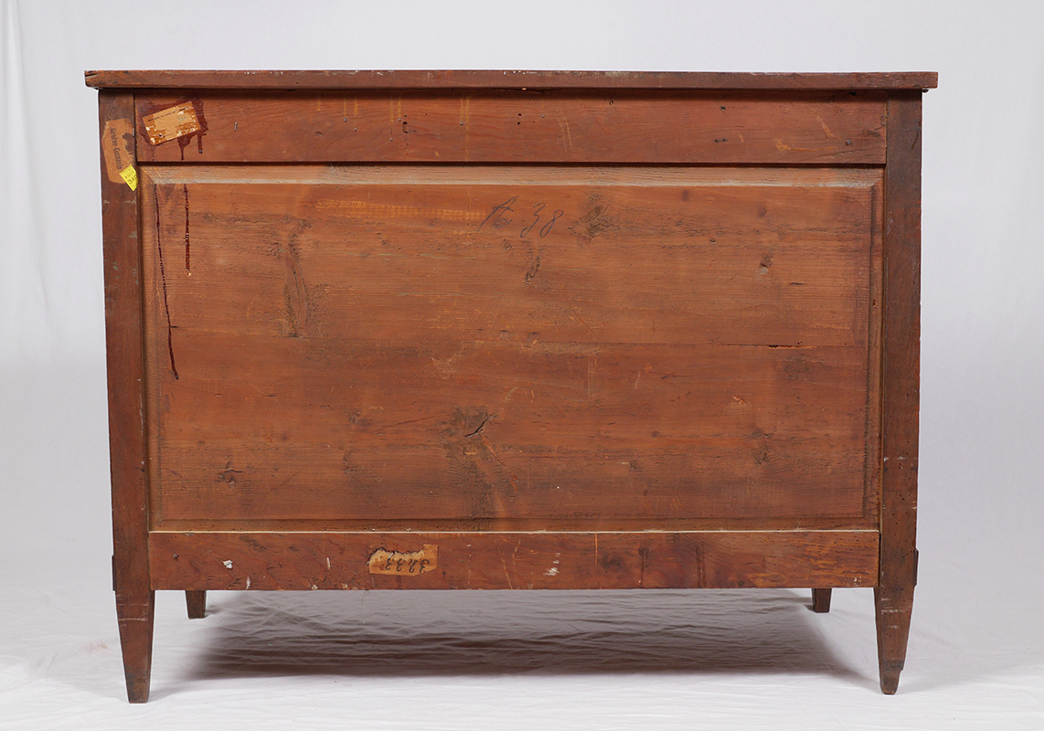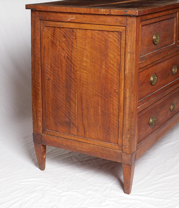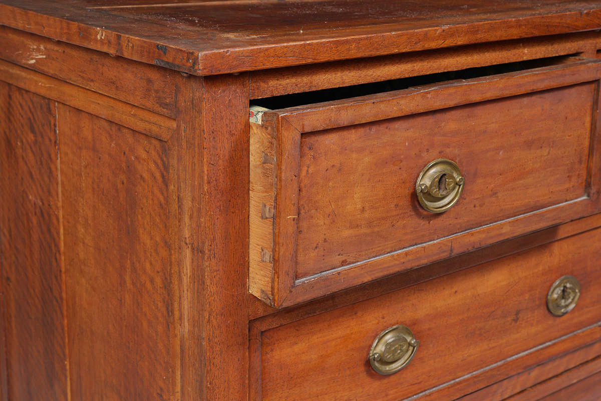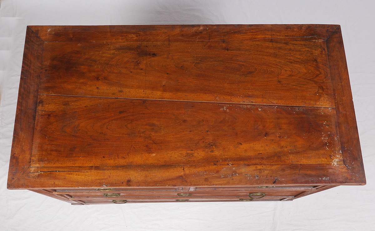 CONTINENTAL WALNUT CHEST OF DRAWERS: Late 18th to early 19th century, 2 half drawers over 2 full length drawers, tapered legs. Pine secondary wood, chamfered drawer bottoms and back, original brass pulls. Overall measures 35 1/4'' h. x 45 3/4'' x 23 3/4''.