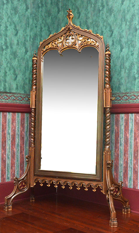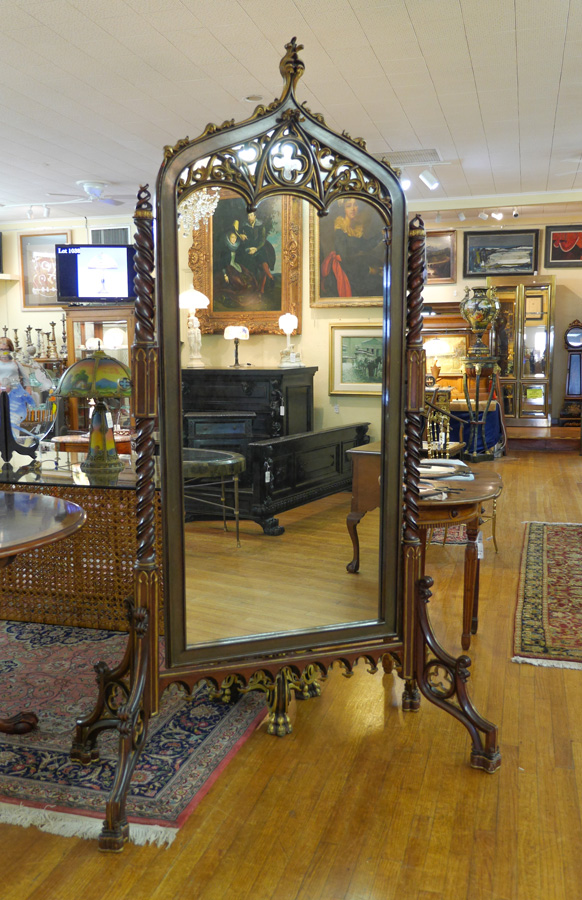 AMERICAN GOTHIC REVIVAL CHEVAL MIRROR: Carved and shaped crest over applied openwork decoration, carved twist column supports, valanced lower trim, 4 openwork splayed legs.