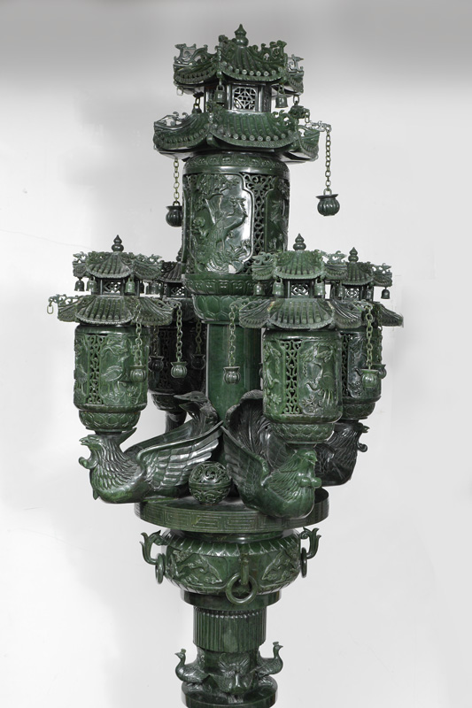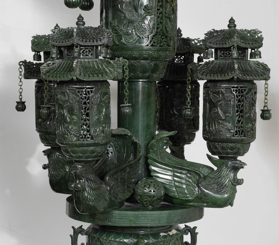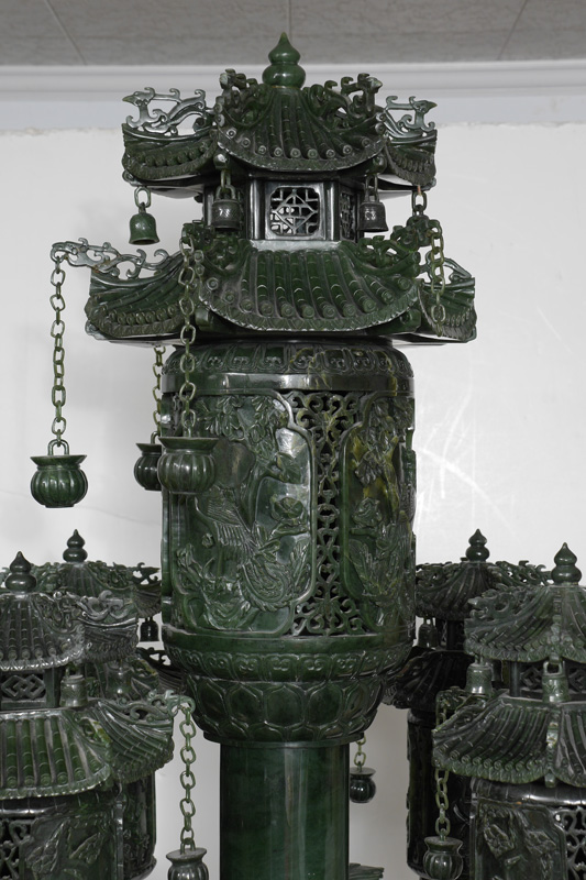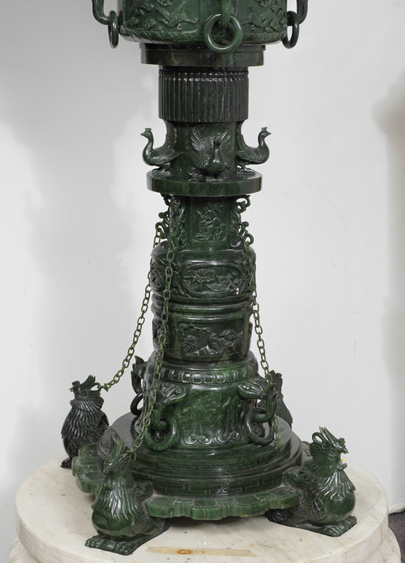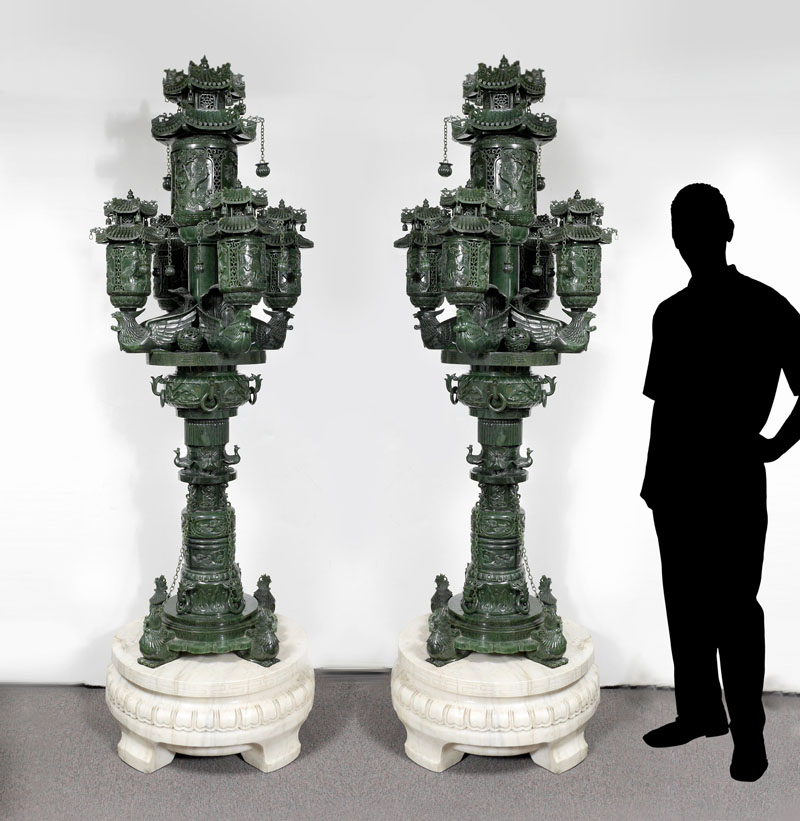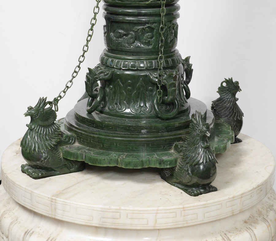 PAIR MONUMENTAL CARVED JADE TEMPLE GARDEN LANTERN: Carved deep nephrite jade or similar stone palatial size garden lantern. Pagoda form top with hanging bells and spheres, large reticulated center light with phoenix bird panels. 4 figural rooster arms, each supporting a reticulated light with cranes in panels. Profusely carved and turned pedestal body with birds, rings, and chains, base with figural rooster feet. Overall measures 75'' h. x 30 1/4''. Sold with large heavy white marble stand, 12 3/4'' h. x 28'' dia.
