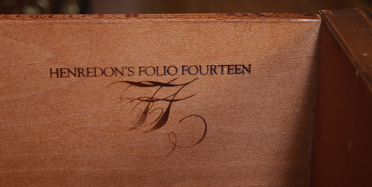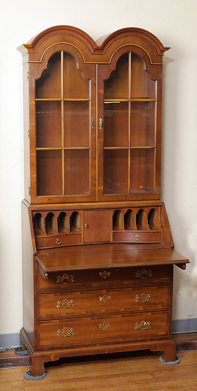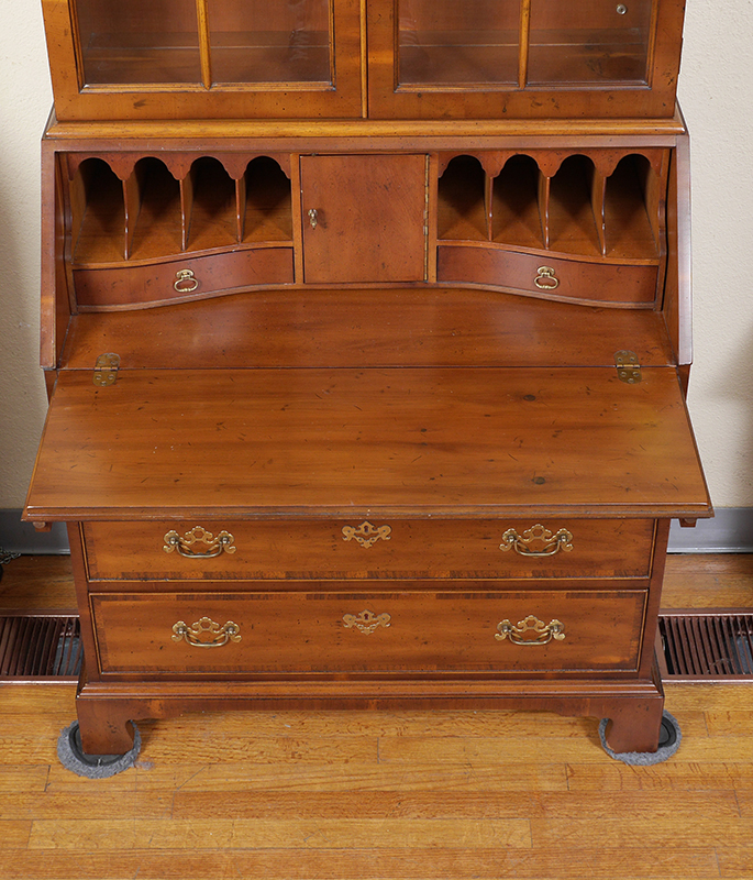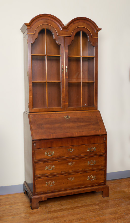 HENREDON GEORGE III STYLE BONNET TOP SECRETARY: From the Folio Fourteen collection by Henredon, double arched pediment, shaped glass doors, s glass shelves. Slant front secretary, fitted interior with door, drawers, and valanced pigeon holes. 3 full length drawers, brass pulls, bracket feet. 81 1/2'' h. x 34 1/2'' x 18 1/2''.