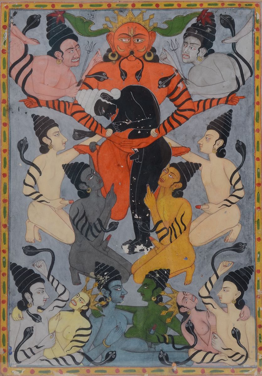 EARLY INDO PERSIAN EROTIC PAINTING: Scene depicts erotic interaction between gods, Gouache, sight size 11.5'' x 8.25'', no visible signature, framed, 18.5'' x 16''.