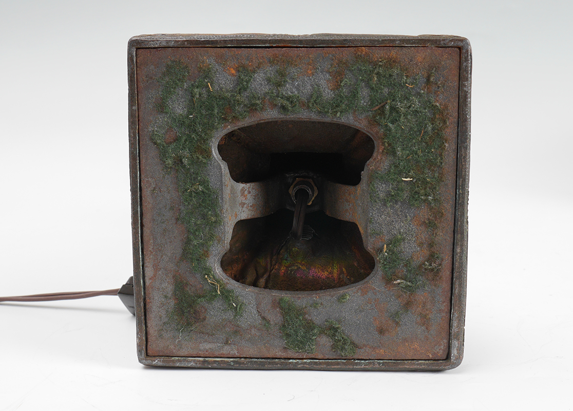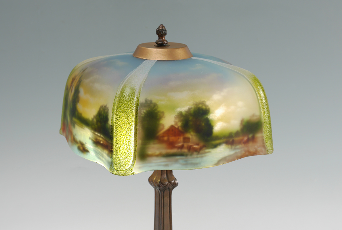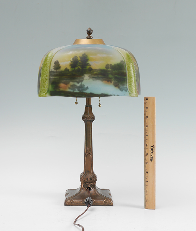 PITTSBURGH LAMP CO. REVERSE PAINTED SHADE LAMP: Unsigned, attributed Pittsburgh Lamp Co., patinated cast metal double socket base with art nouveau stylings, 20'' h. x 5 1/2''. Molded squared shade with green textured ribs at corners, reverse painted stream and lake landscapes, 5 3/4'' h. x 11 3/4''.