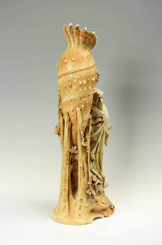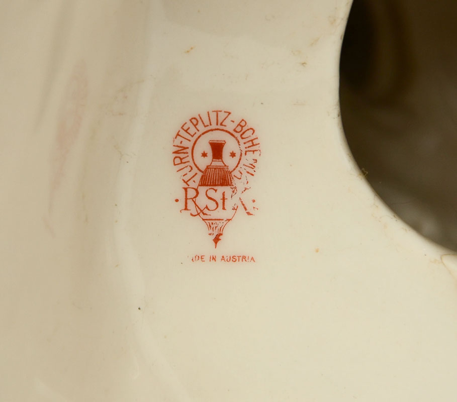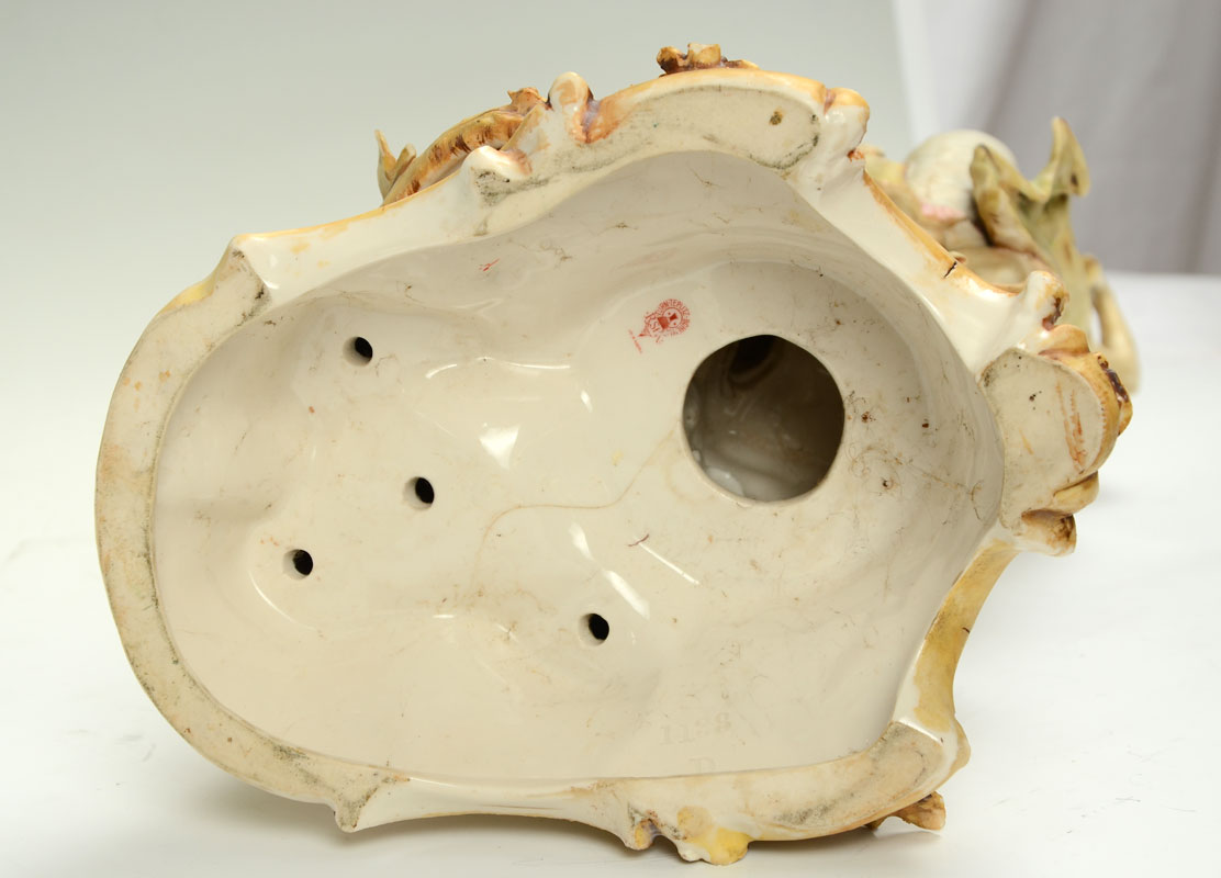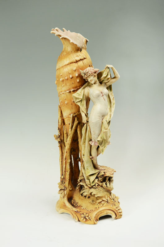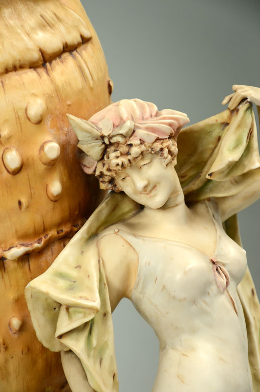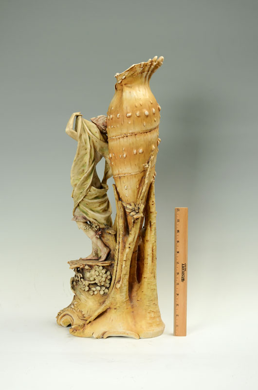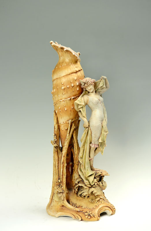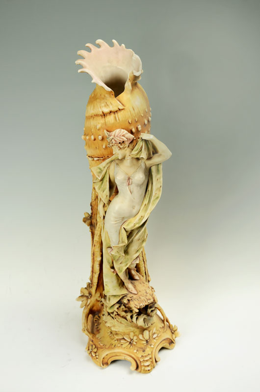 RIESSNER & STELLMACHER AMPHORA TURN TEPLITZ FIGURAL VASE: Stylized shell vase with figure of maiden holding draped sheets, applied floral decoration. Riessner & Stellmacher mark on base. 26'' h. x 8 1/2'' x 10 1/2''.