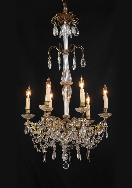 6 LIGHT CRYSTAL AND BRASS CHANDELIER: 2 tiers of crystal crops over 6 cast brass foliate arms, crystal prism, drops and swags. Overall 40'' h. x 24''.