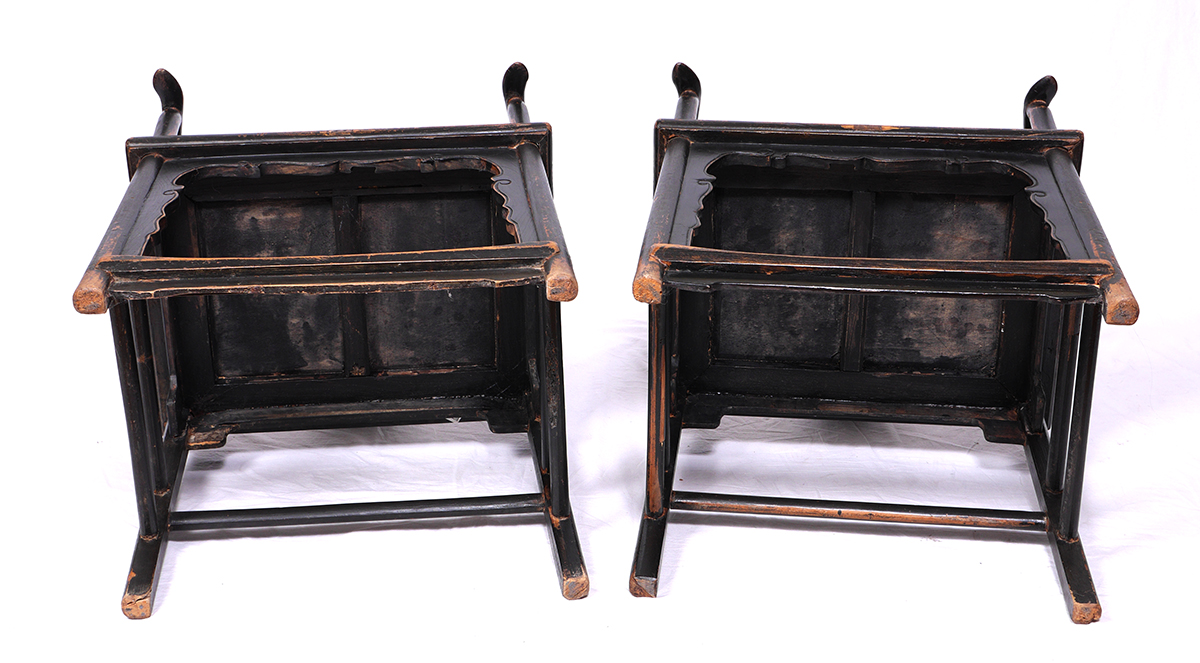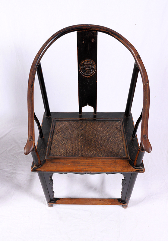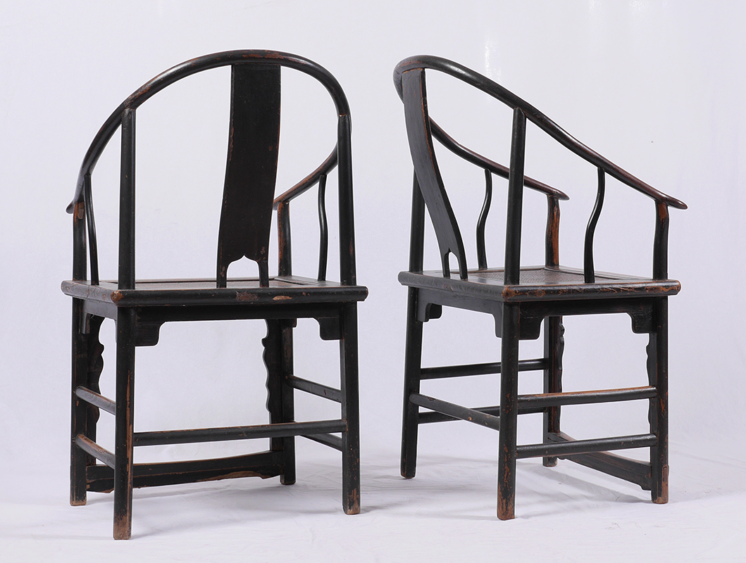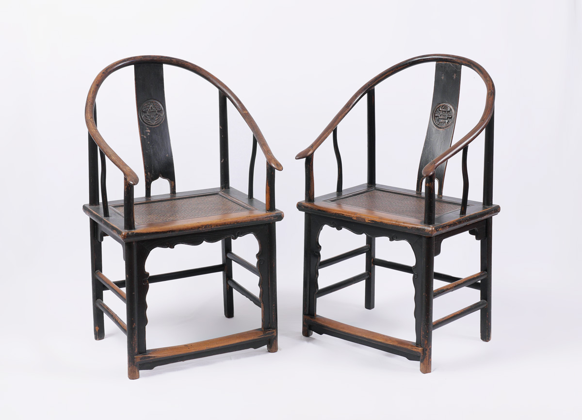 PAIR CHINESE HORSESHOE BACK ARM CHAIRS: Remnants of black paint, curved top rails extending to arms, shaped back splat with carved medallions, woven square seats, shaped skirt. Overall measures 40 1/2'' h. x 24'' x 22''.