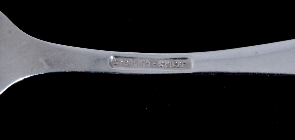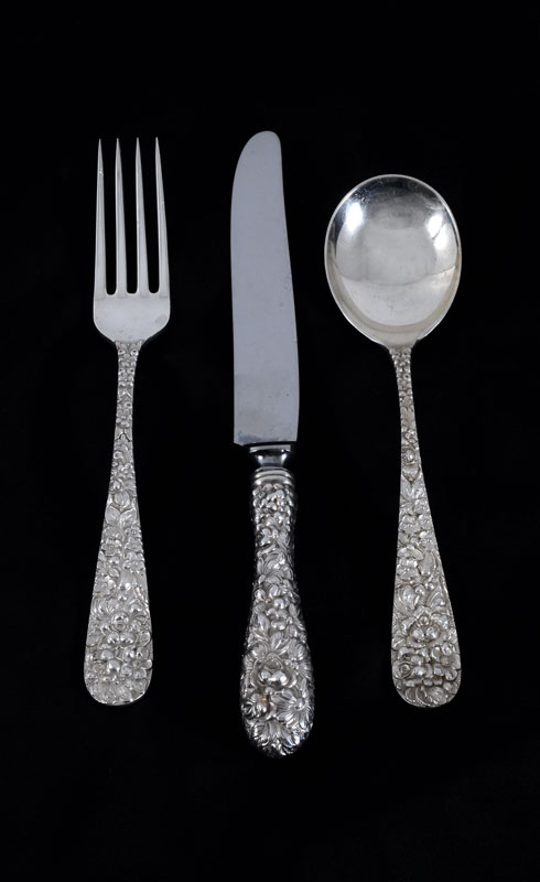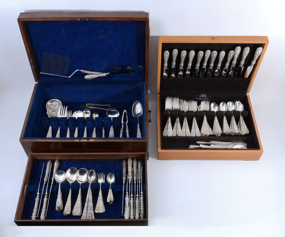 MASSIVE STIEFF ROSE STERLING FLATWARE SERVICE: Approx. 186 pieces in the ''Stieff Rose'' Pattern by Stieff to include 12 forks (7 3/8''), 12 forks (6 7/8''), 12 salad forks (6''), 24 teaspoons (5 1/2''), 12 Soup spoons (6 7/8''), 12 soup spoons (5 1/2''), 12 iced tea spoons (7 1/2''), 12 demitasse spoons (4 1/4''), 12 fruit spoons (6''), 12 ice cream forks (5 3/4''), 15 hollow knives (9 1/2''), 9 hollow knives (8 3/4''), solid master butter knife (7''), 10 solid butter knives (6''), cocktail fork (6''), 12 cocktail forks (5 5/8''), 4 tablespoons (7 3/4''), cold meat fork (7 1/2''), cake server (10''), angel food cake comb (10 5/8''), sugar tongs (4 3/8''), nut cracker (6 5/8''), berry spoon (9 1/8''), berry spoon (8 1/8''), sugar scoop (6''), jam spoon (5 7/8''), 2 pierced bowl olive forks (5 3/8''), small serving spoon (5 3/8''), gravy ladle (5 3/4''), hollow handle pick (5 1/2''). Approx. 190 troy oz. Sold with 2 silver chests.