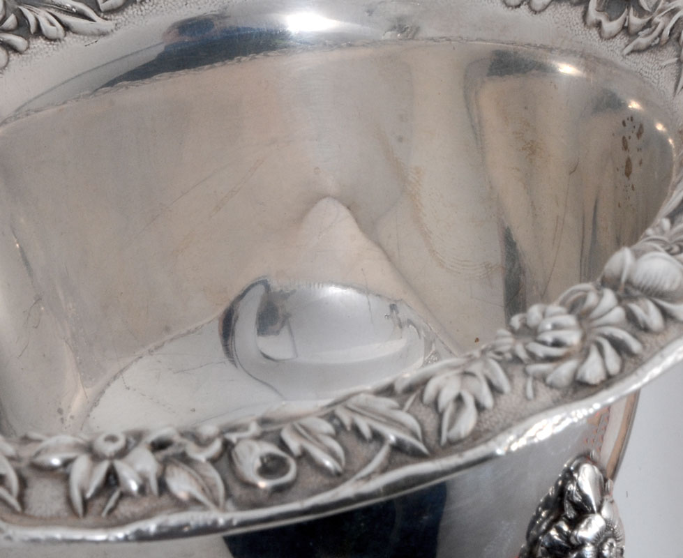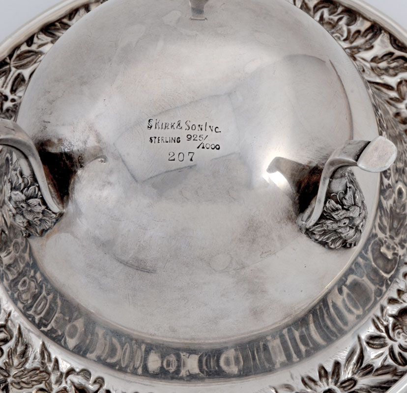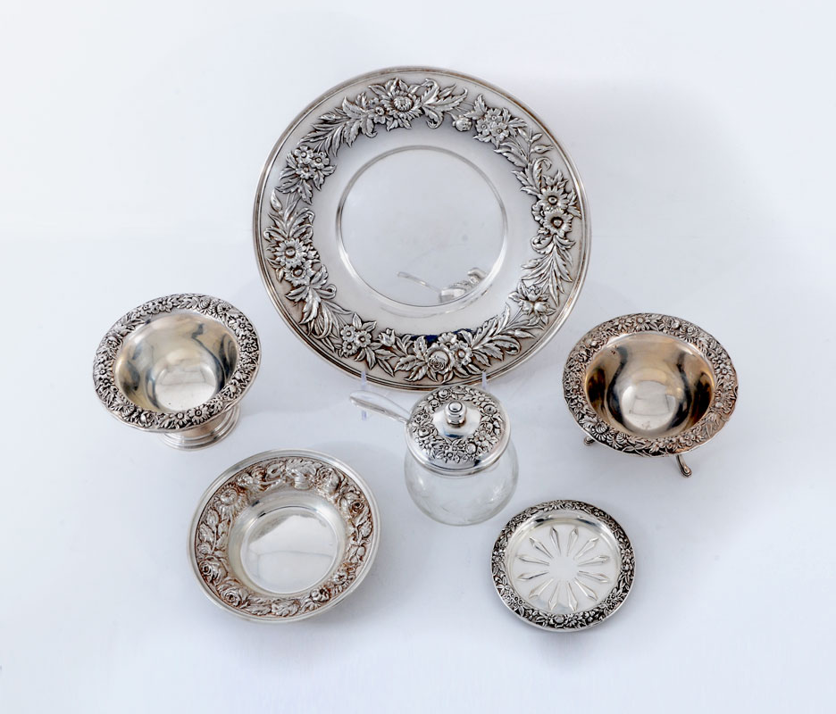 6 PIECE KIRK & STIEFF STERLING HOLLOWARE: An assembled collection, each piece with repousse floral motifs, to include 1) S. Kirk & Son charger 10 1/4'' dia. 2) Stieff small bow, 5 1/2'' dia. 3) S. Kirk & Son bowl on 3 feet, 5'' dia. 4) S. Kirk & Son jelly jar with etched glass body, glass spoon, 4 1/4'' h. 5) S. Kirk & Sons footed bowl, 5'' dia. 6) S. Kirk & Sons coaster 4 1/4''. Approx. 27.8 troy oz.