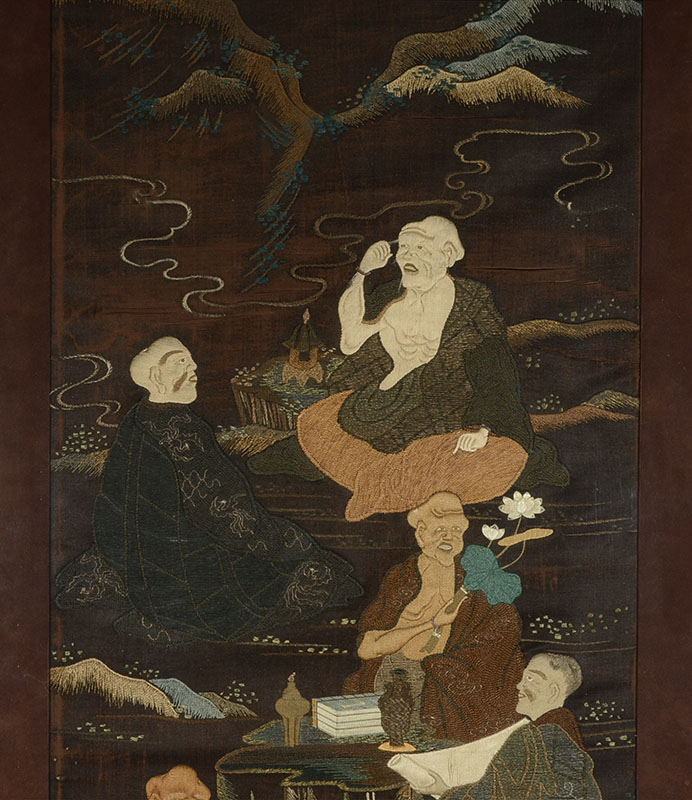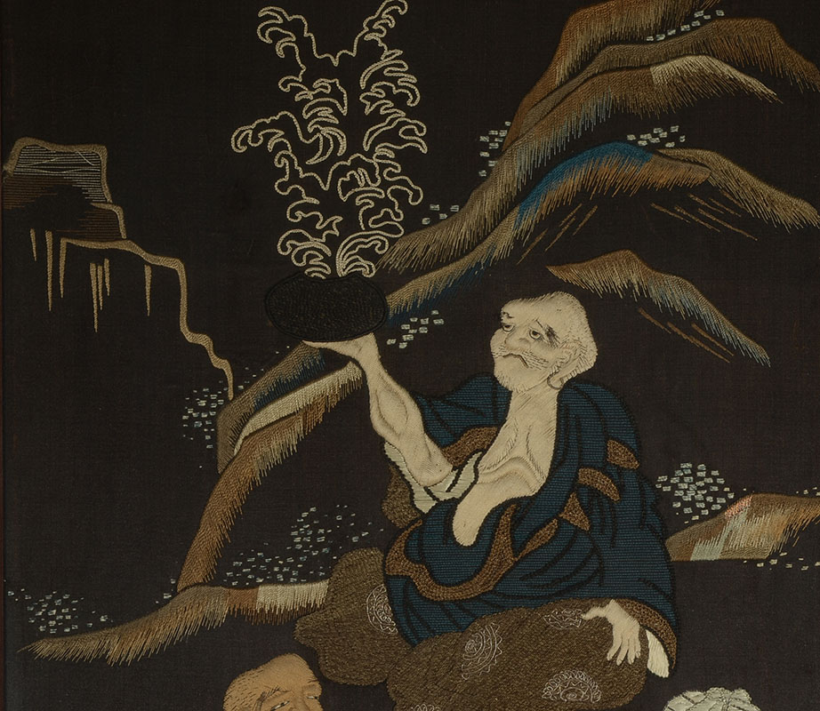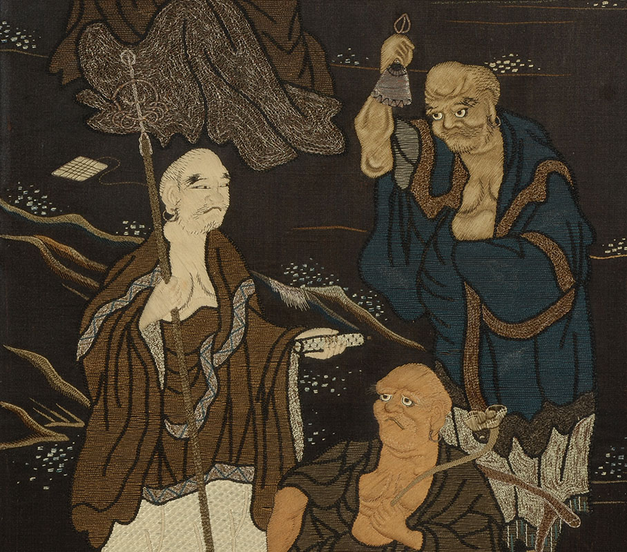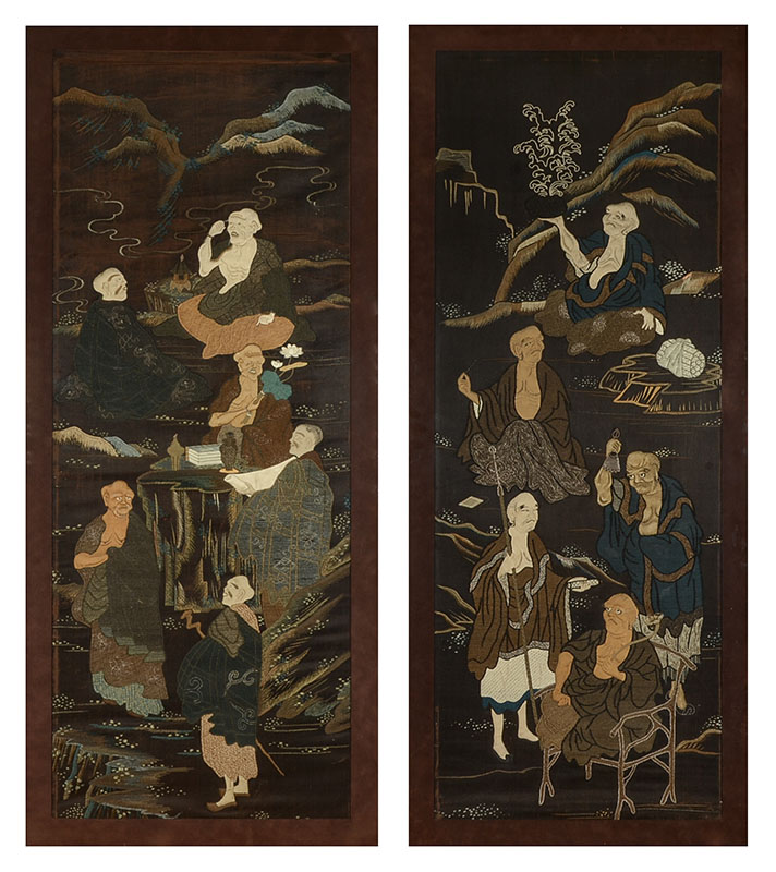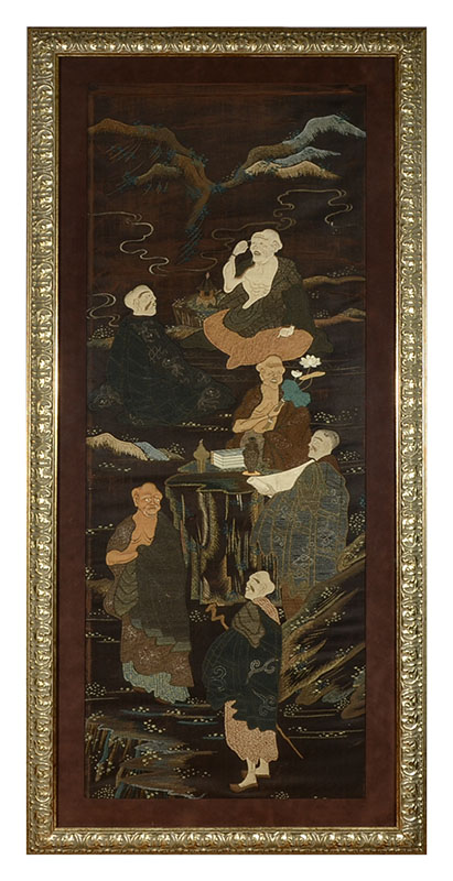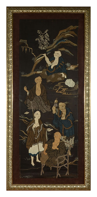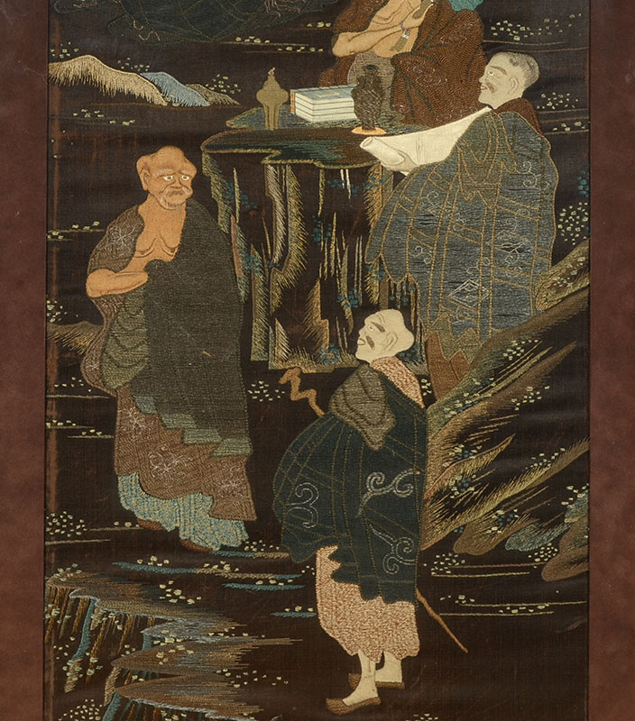 FINE PAIR OF MEIJI NEEDLEPOINT TAPESTRIES: Probably 19th Century, Depicting Several Figures Worshipping in a Landscape, art work size approx. 46'' x 17'', framed, 54'' x 25''.