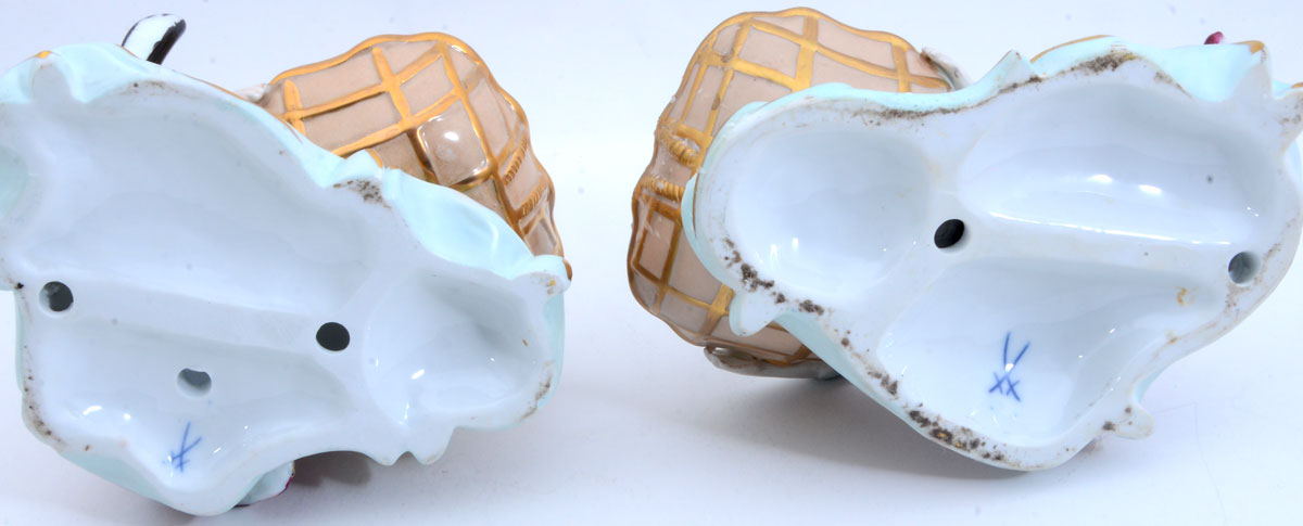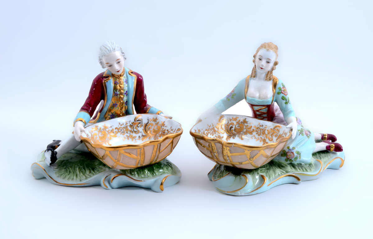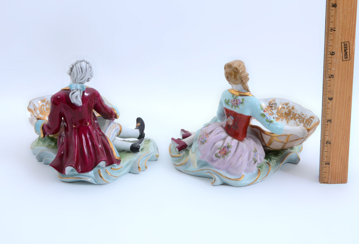 PAIR OF FIGURAL MEISSEN PIN TRAYS: Polychrome decorated figures of a seated man and woman, each holding a pin or ring tray, blue Meissen underglaze crossed swords marks. Measures 5 1/4'' h. x 7'' x 4 1/2''.