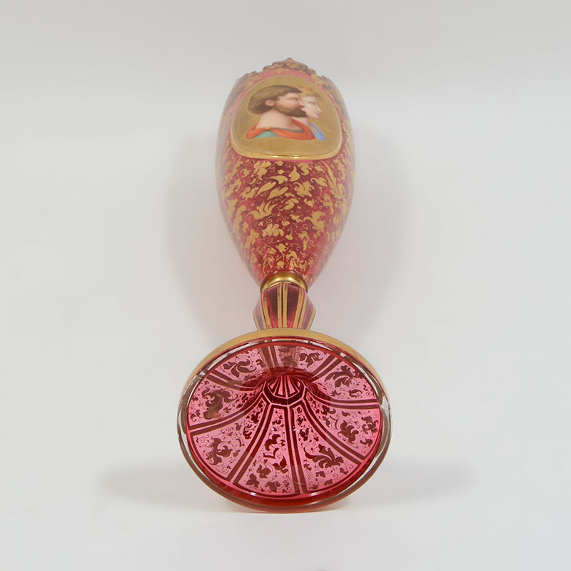 BOHEMIAN CRANBERRY GLASS PORTRAIT VASE: Scalloped rim, cranberry glass body with applied portrait of noble man and woman, balance of body with gilt arabesque foliate decoration, 16'' h. x 4 1/2''.