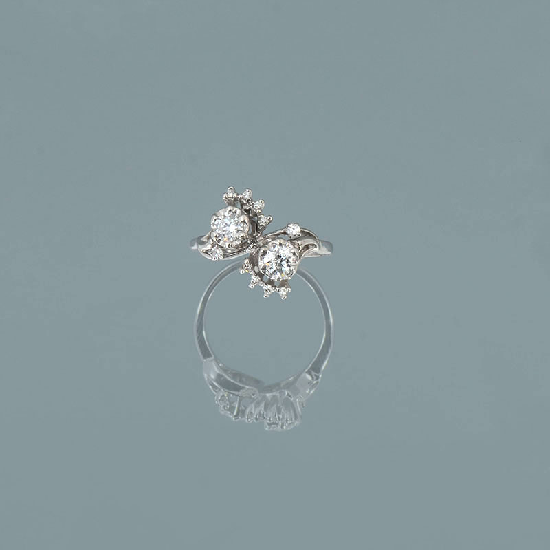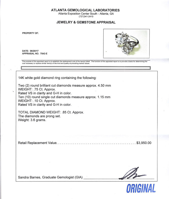 14K RETRO DECO BYPASS DIAMOND RING: 2 featured period cut diamonds are .75CT and are VS-SI in clarity and G-H in color. 10 round single cut diamonds are .10CT. Total weight is 3.6 grams approx. Size 5.5. Sold with current Atlanta Gemological GIA graduate's appraisal for $3950.