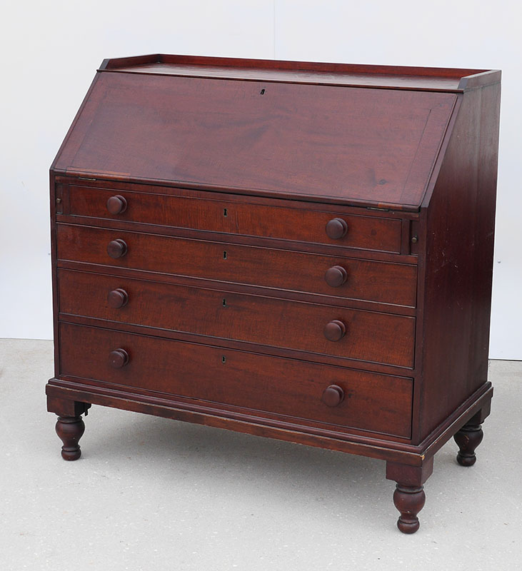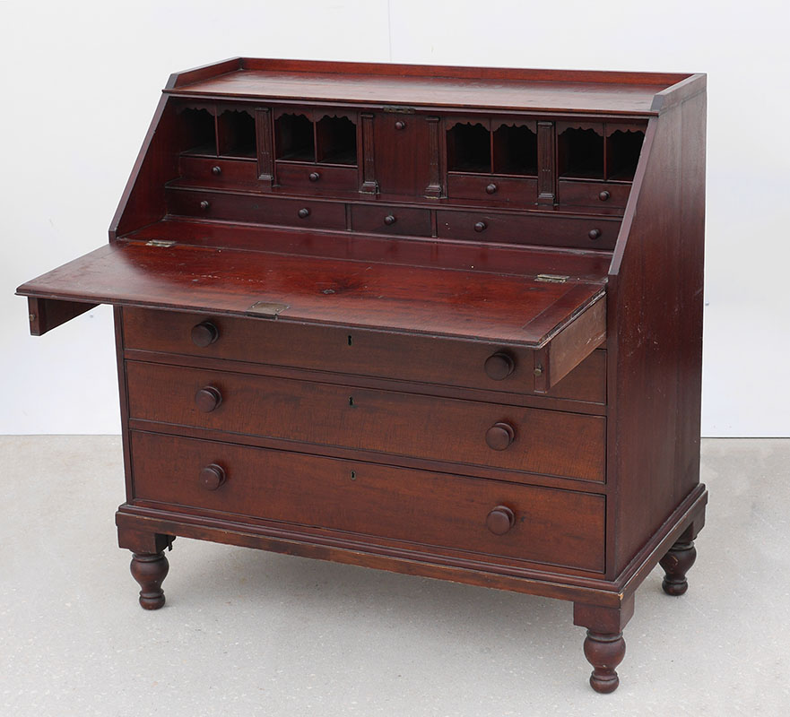 LARGE 19TH CENTURY MAHOGANY SLANT FRONT DESK: Top with wood rail, fitted interior with drawers, false door, valanced pigeon holes, fluted columns. 4 graduating full length drawers, 4 turned legs. Overall 46 3/4'' x 45'' x 24 1/2''.