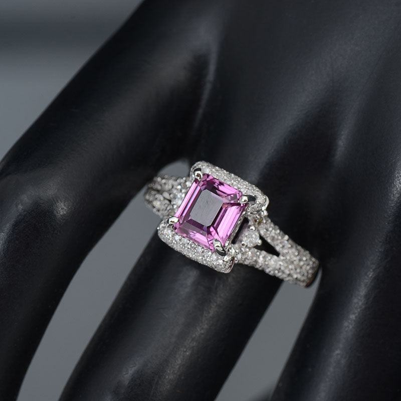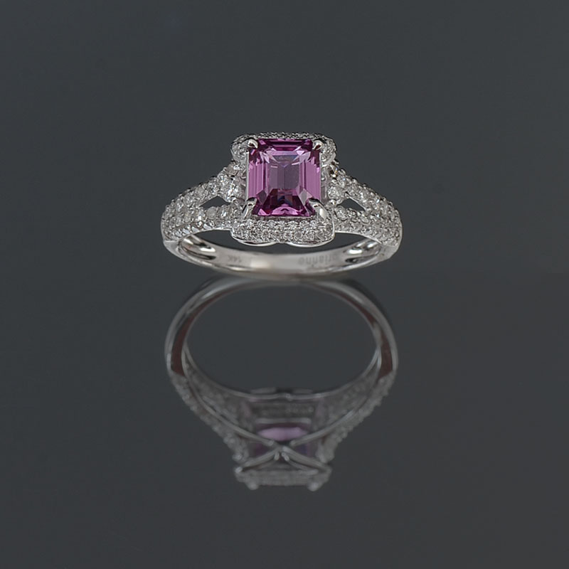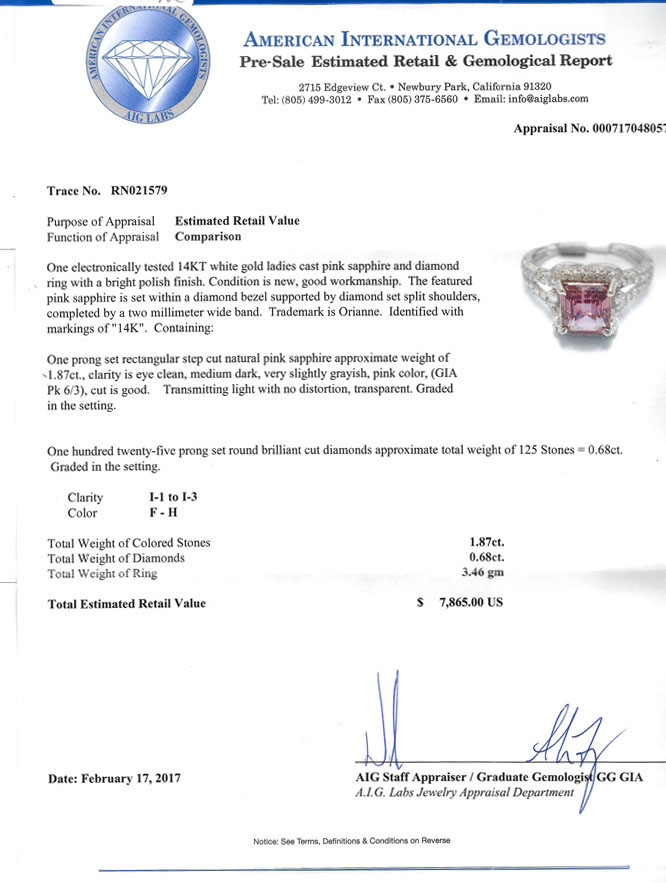 1.87CT PINK SAPPHIRE & DIAMOND RING IN 14K: Pink sapphire is set within a diamond bezel supported by diamond split shoulders. Sapphire is rectangular step cut and is framed by 125 round brilliant cut diamonds rated I1-I3 in clarity and F-H in color. Size 7. Total weight 3.46 grams. Sold with AIGL appraisal which reflects $13,122 as their opinion of replacement value for this ring.