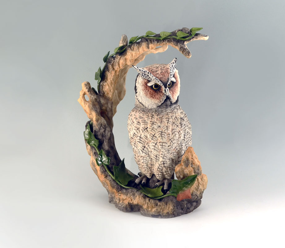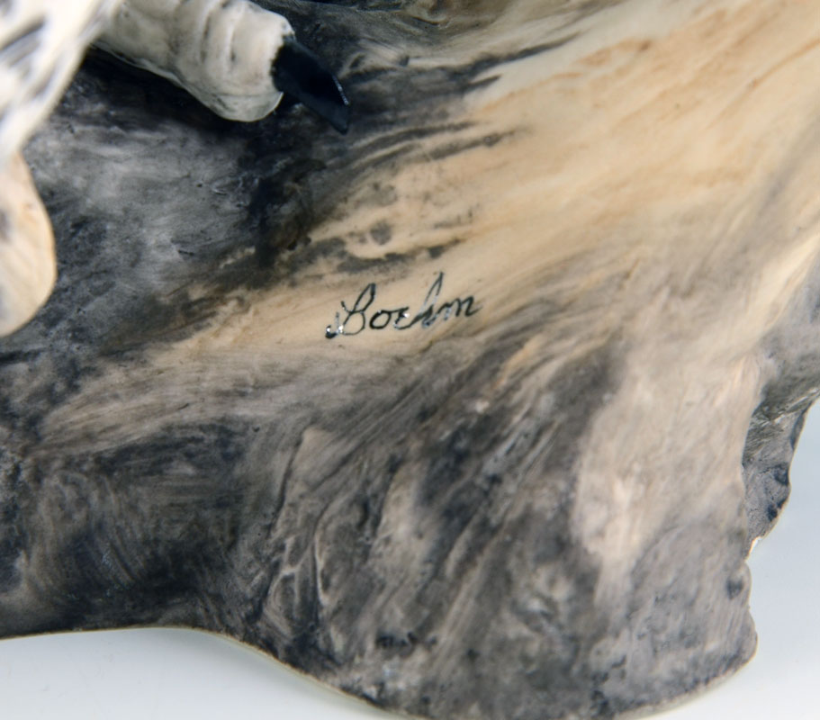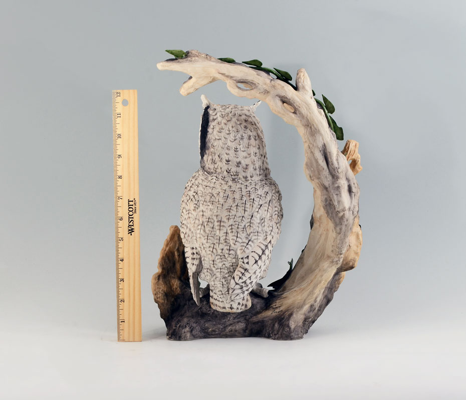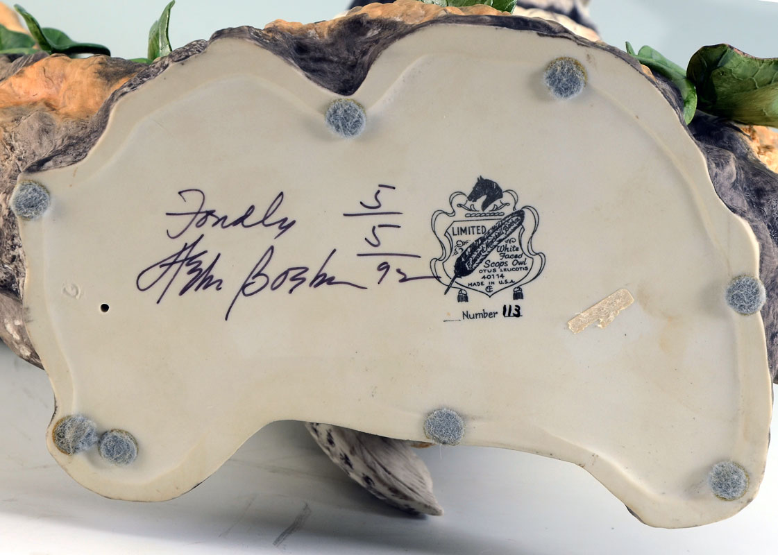 BOEHM WHITE FACED SCOPS OWL PORCELAIN FIGURE: Limited edition figure with of owl with branch and vine, #40114, marked on base no. 113 and signed by Helen Boehm, 14 1/4'' h. x 10'' x 6''. No box.