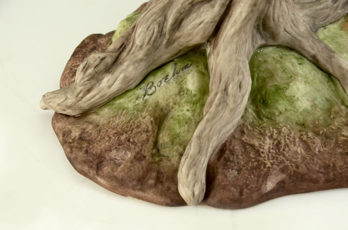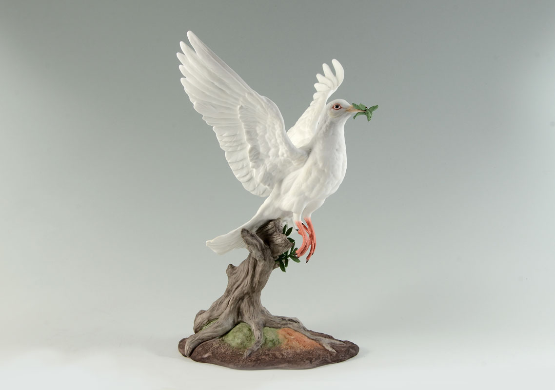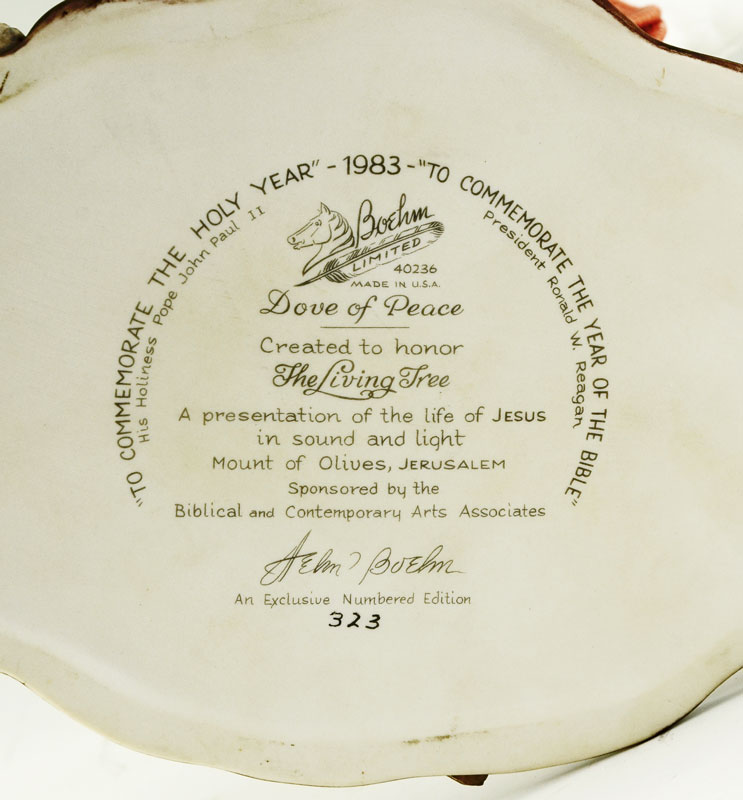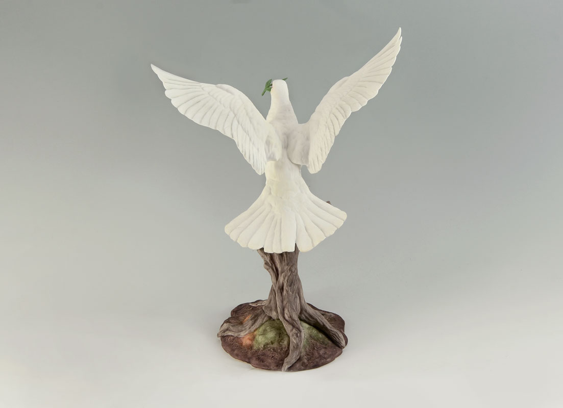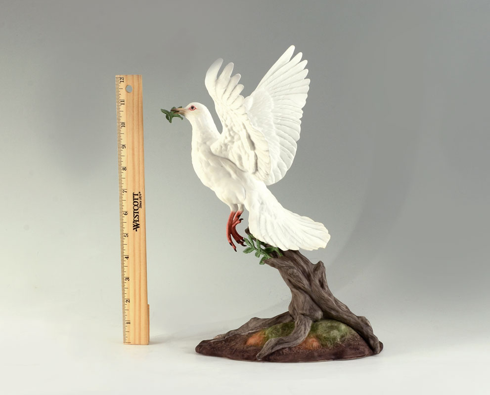 BOEHM WHITE DOVE OF PEACE PORCELAIN FIGURE: 1983 limited edition figure of a dove in flight with olive branch, #40236, marked on base with number 323, measures 13 1/4'' h. x 11 1/4'' x 9 1/2''. No box.