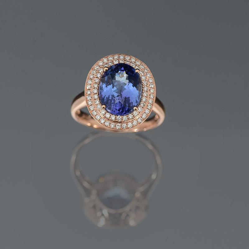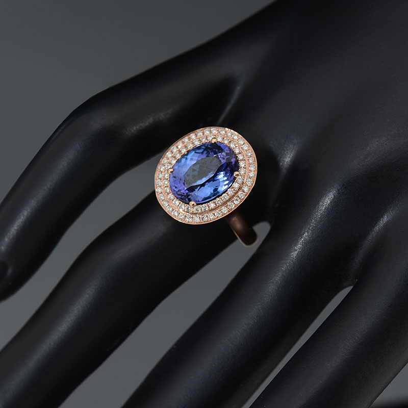 ELEGANT 14K TANZANITE & DIAMOND RING: 14K rose gold ring contains one oval mixed cut tanzanite. Weight: 4.61 Ct. Approx. Rated VS in clarity, bV in Hue, 4-5 in Tone and 4 in Saturation. GIA Report # 6202009499. 70 round brilliant cut diamonds. Weight: .45 Ct. Approx. Rated VS in clarity and G-H in color. The tanzanite and diamonds are prong set. Weight: 4.7 grams Size: 7