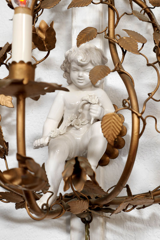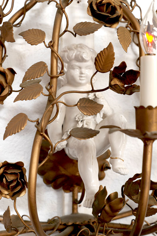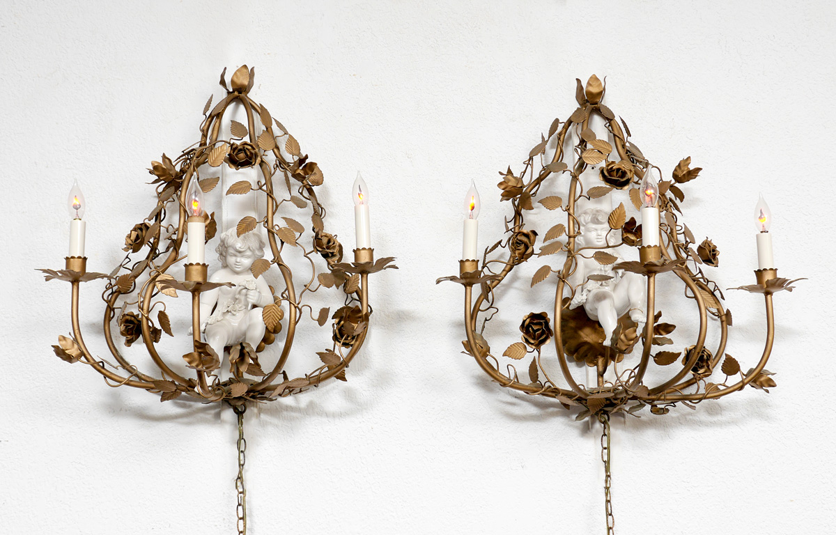 PAIR OF FIGURAL CHERUB SCONCES: Painted brass rose vine motif birdcage frames, center white porcelain figural cherub center, 3 lights, overall measures 22 3/4'' h. x 22 3/4'' x 12 1/2''.