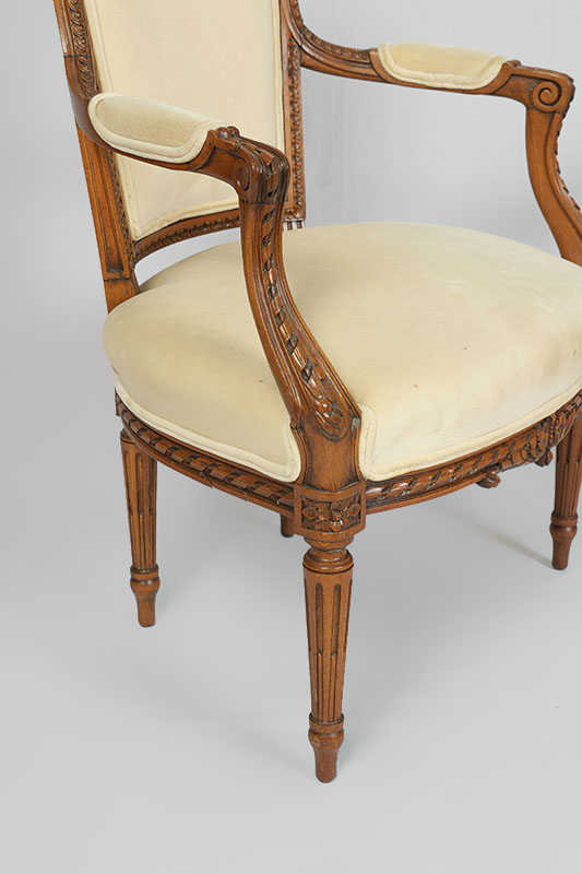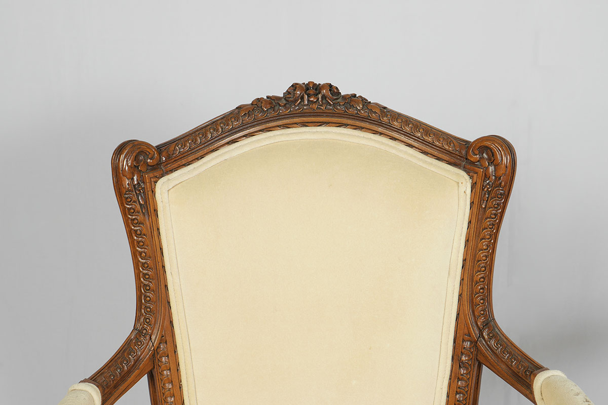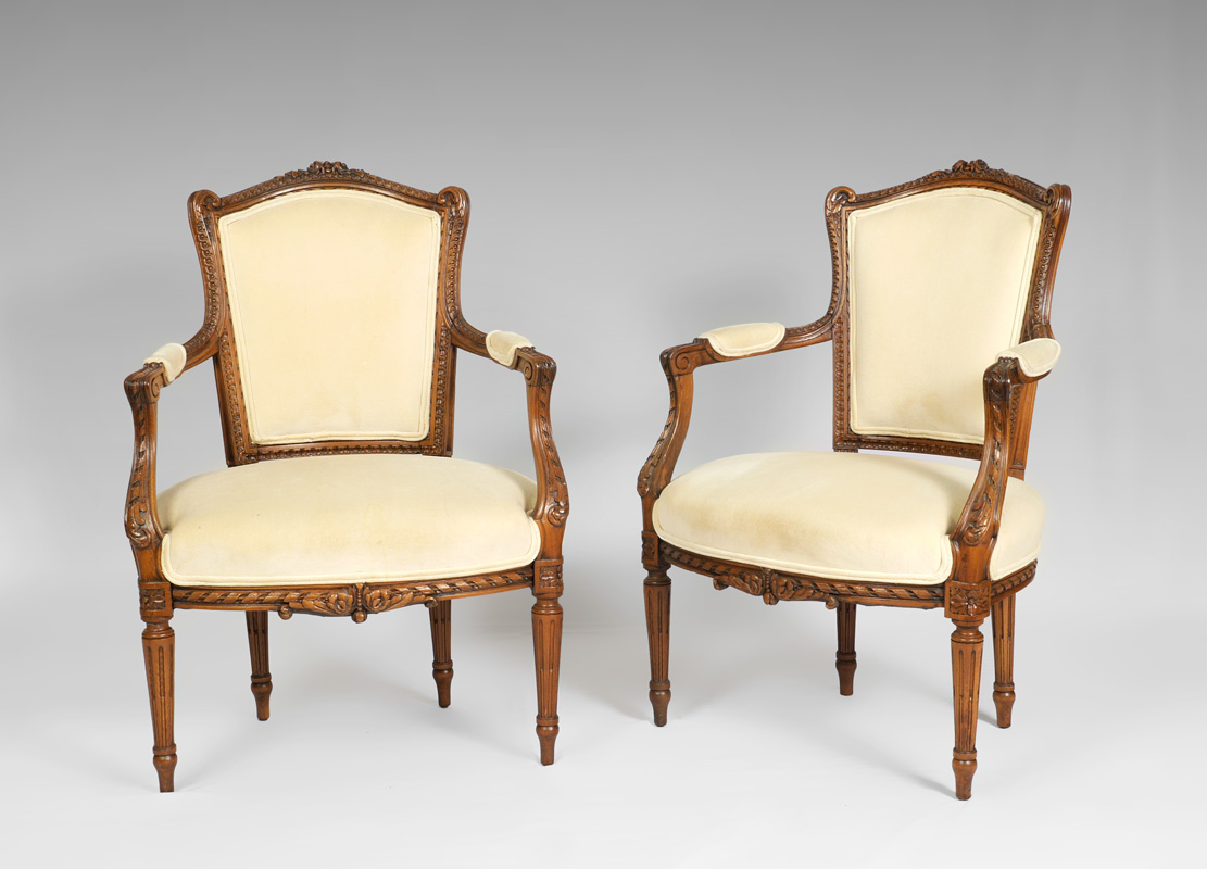 PAIR 19TH CENTURY FRENCH FAUTEUIL ARM CHAIRS: Profusely carved and shaped frame with foliate motifs, cream upholstery, tapered fluted legs. 36'' h. x 25 3/4'' x 23''.