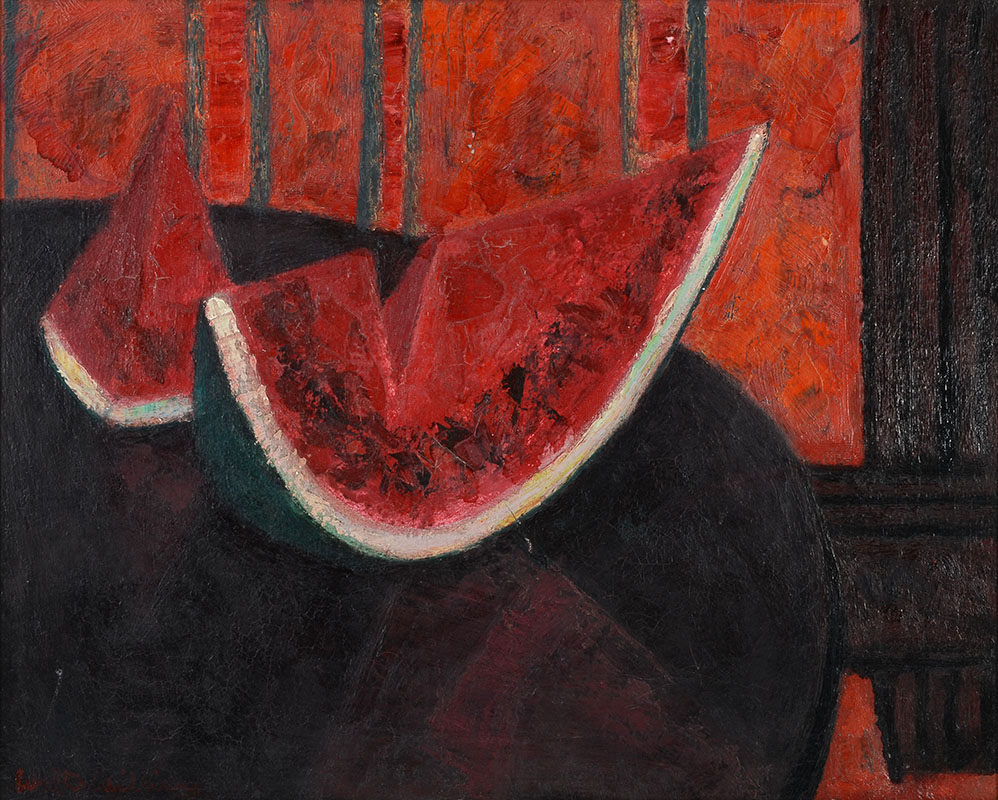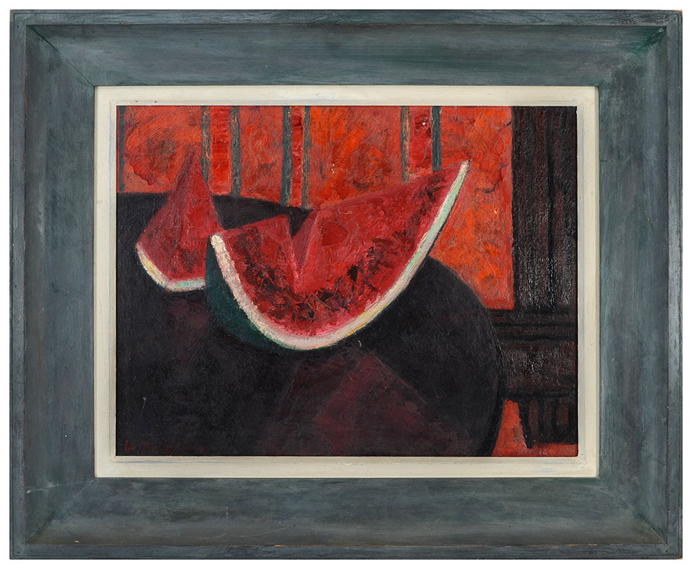 WILLIAMS, Walter Henry (American, 1920-1998): Still Life of Watermelon, Oil/Canvas, 16'' x 20'', signed lower left and written on the canvas verso ''W. Williams'', original painted frame, 23.15''x 27.5''. Williams was born in New York where he studied art at the Brooklyn Museum Art School. Although he moved to Denmark, when he returned briefly to the U.S. he produced a bod of work reflecting his experiences of being an African American living in the South.