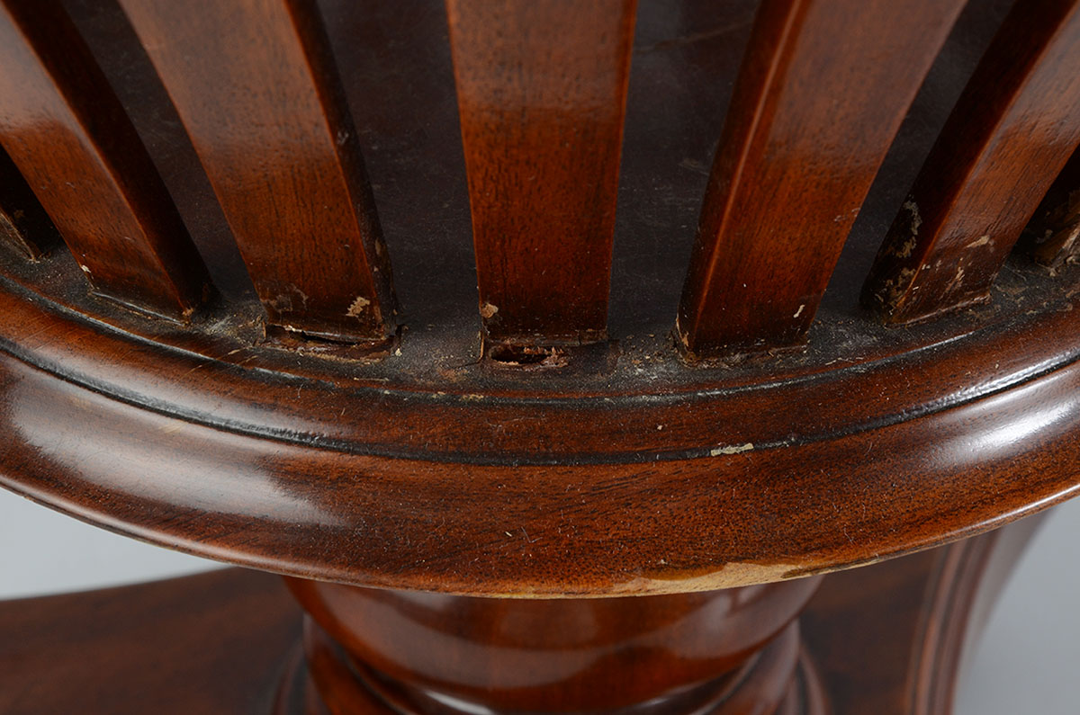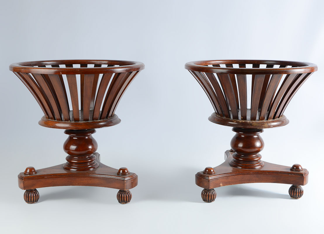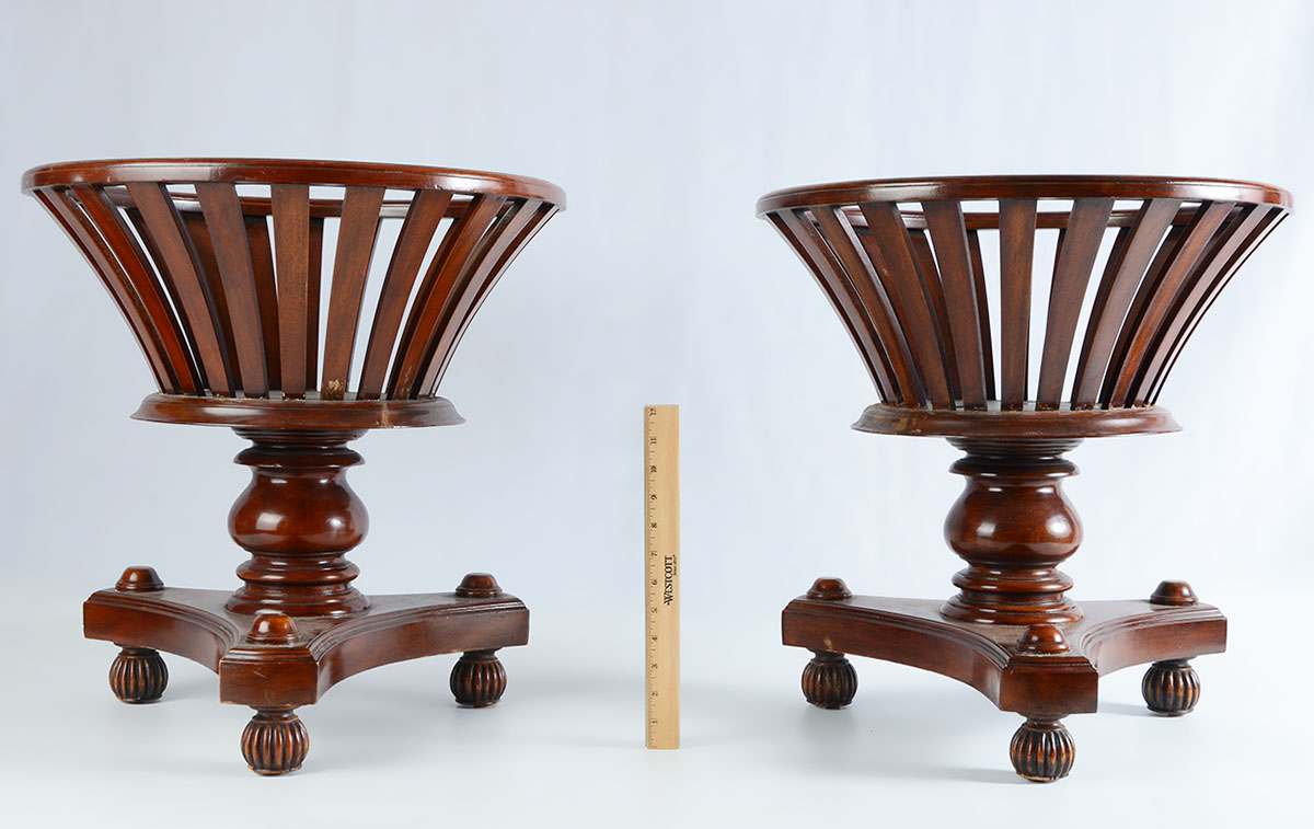 PAIR ENGLISH REGENCY STYLE WOOD BASKET PLANTERS: Bentwood slatted top bowl, turned column, splayed base on 3 fluted feet. 20'' h. x 19 1/2'' top dia.