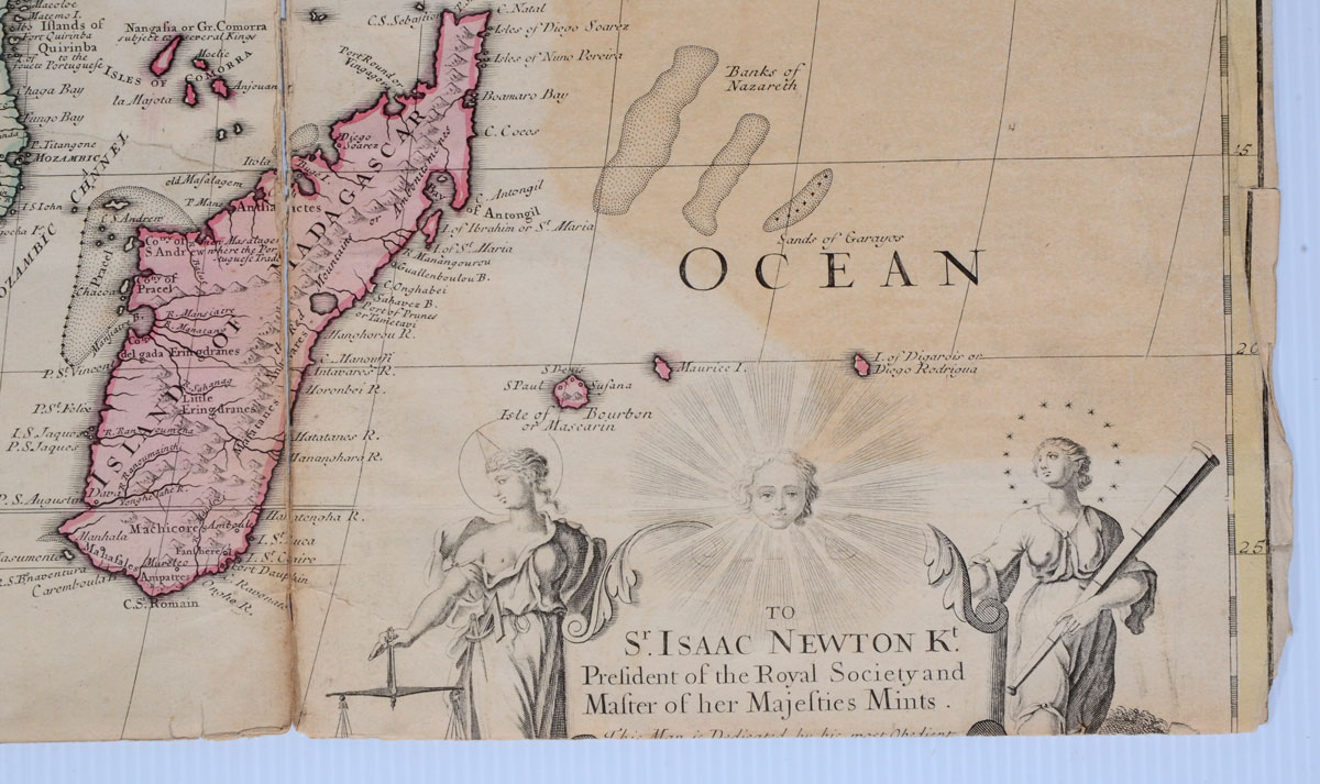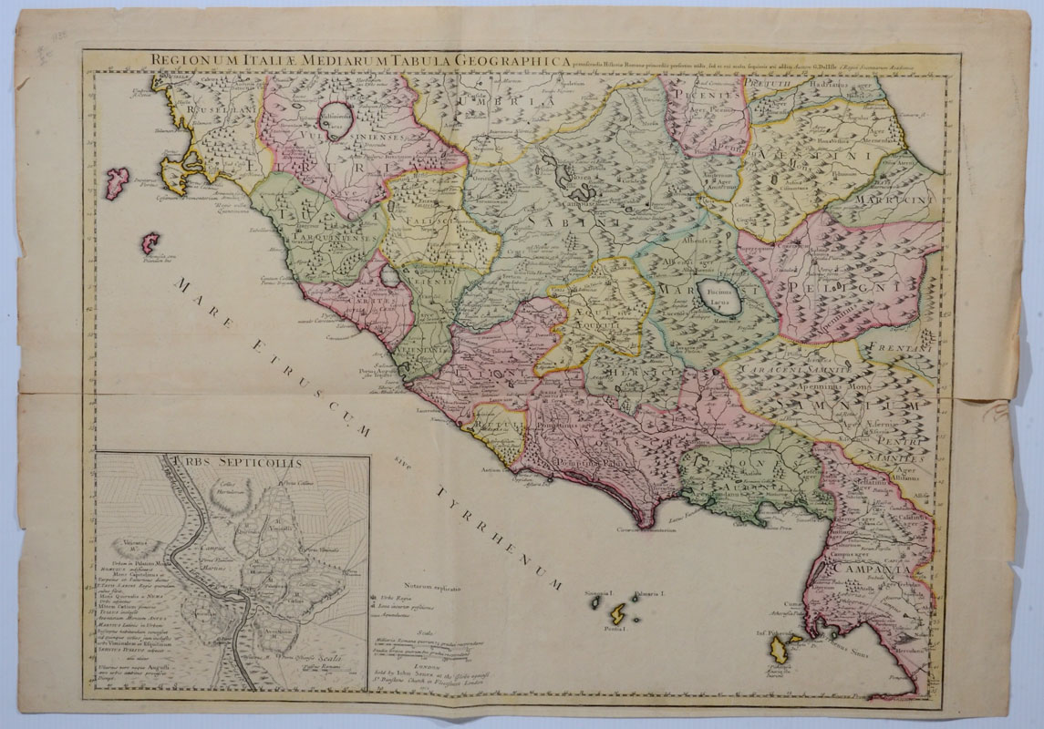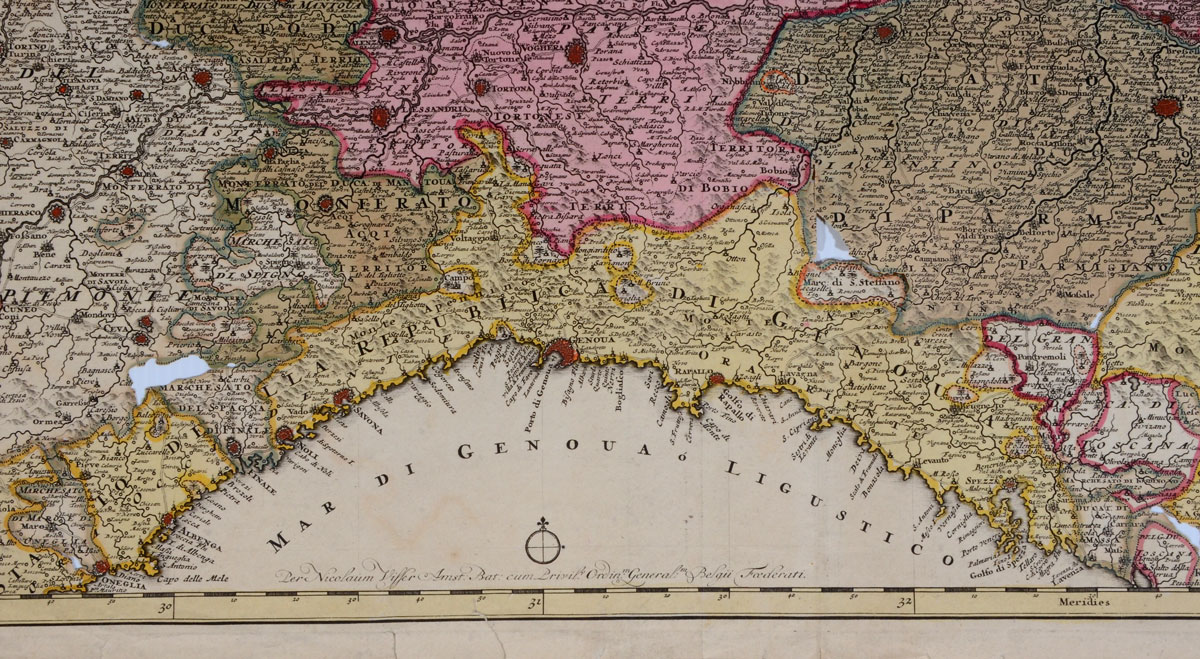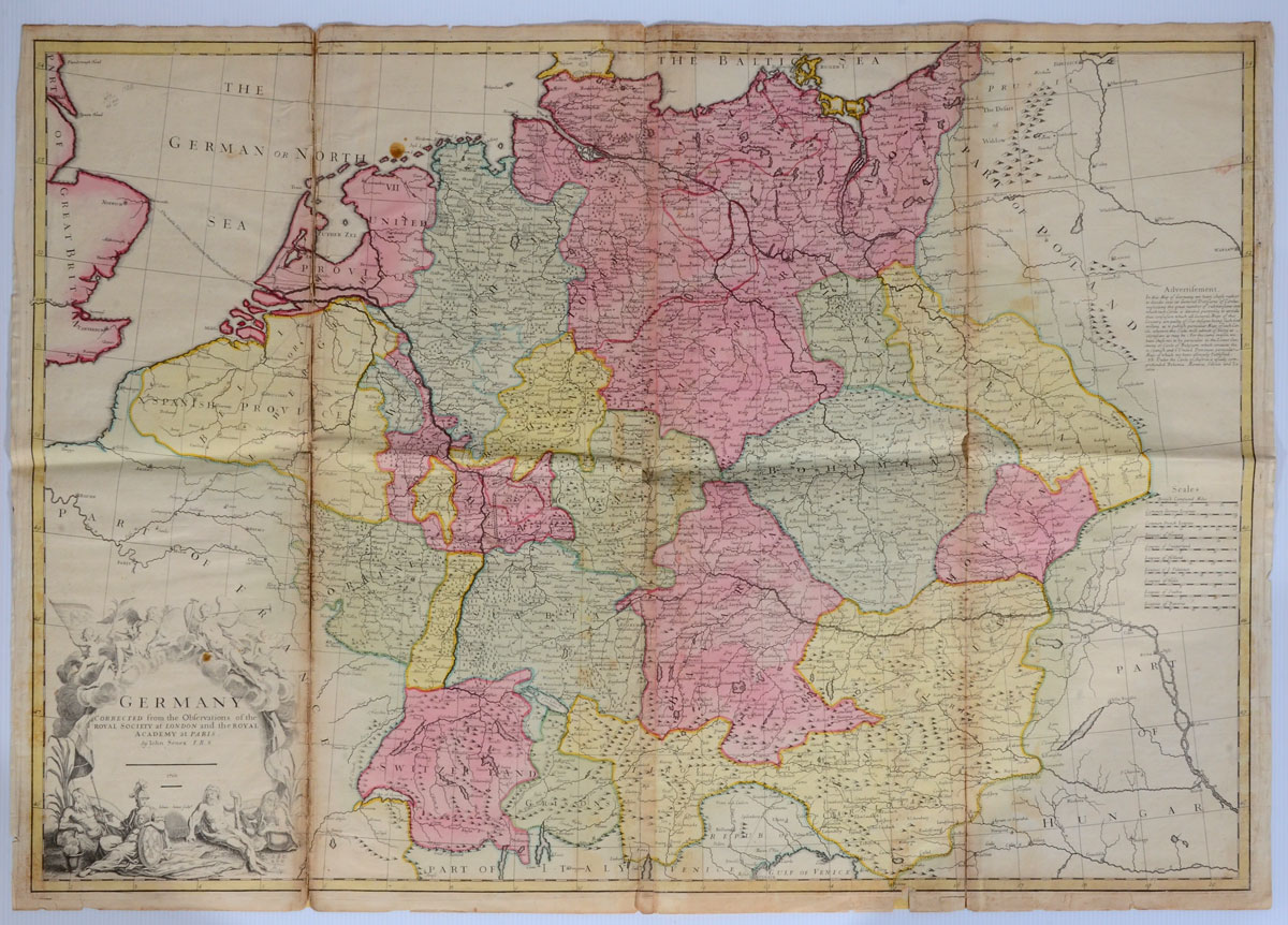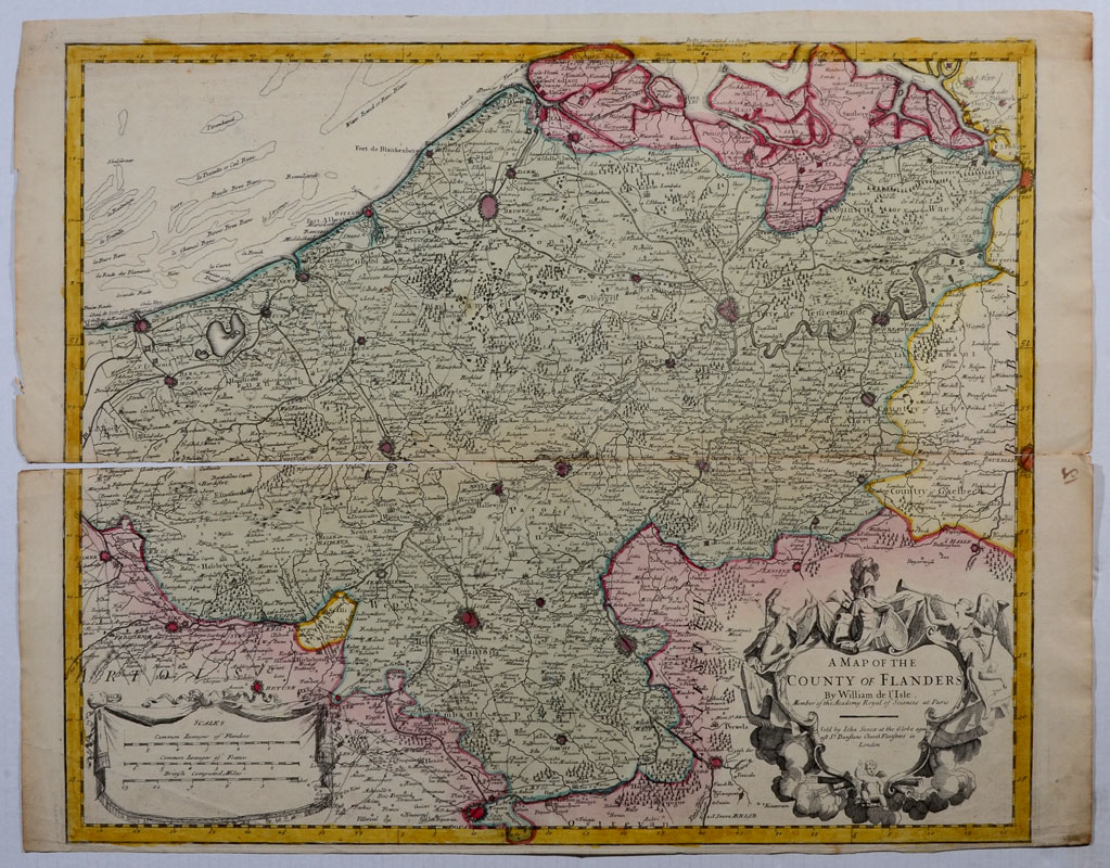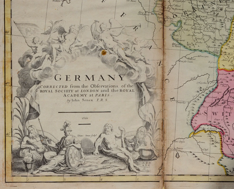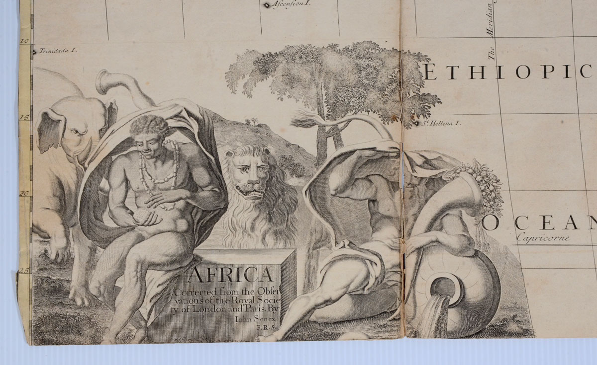 COLLECTION OF 6 ANTIQUARIAN 18TH CENTURY MAPS: An assembled collection of 6 antique maps to include 1) John Senex ''Africa Corrected from the Observations of the Royal Society of London and Paris'', published 1714, 25 1/2'' x 38 1/2''. 2) Nicolaes Visscher (Nicolas Visser) ''De Stoel des Oorlogs in Italien...'', map of section of Italy, circa 1700, 24 1/2'' x 31''. 3) William de L'Isle ''Map of the County of Flanders, circa 1710, 20'' x 26 3/4''. 4) Daniel Veelward, ''Karte van de Zuidlijke Provincien der Vereenigde Staaten'', circa early 1800's, 18 1/2'' x 22''. 5) John Senex '' GERMANY Corrected from tha observations of the Royal Society at London and the Royal Academy at Paris by John Senex FRS. 1710'', circa 1710, 26 3/4'' x 38 3/4''. 6) Guillaume de L'isle, Sold by John Senex, ''Regionum Italiae mediarum tabula geographica : pernoscendis historiae Romanae primordiis praesertium utilis, sed et cui multa sequioris aevi addita / auctore G. DelIisle, e Regia^ Scientiarum Academiae socio.'', circa 1712, 19 1/4'' x 26 1/4''. All measurements with margins included.