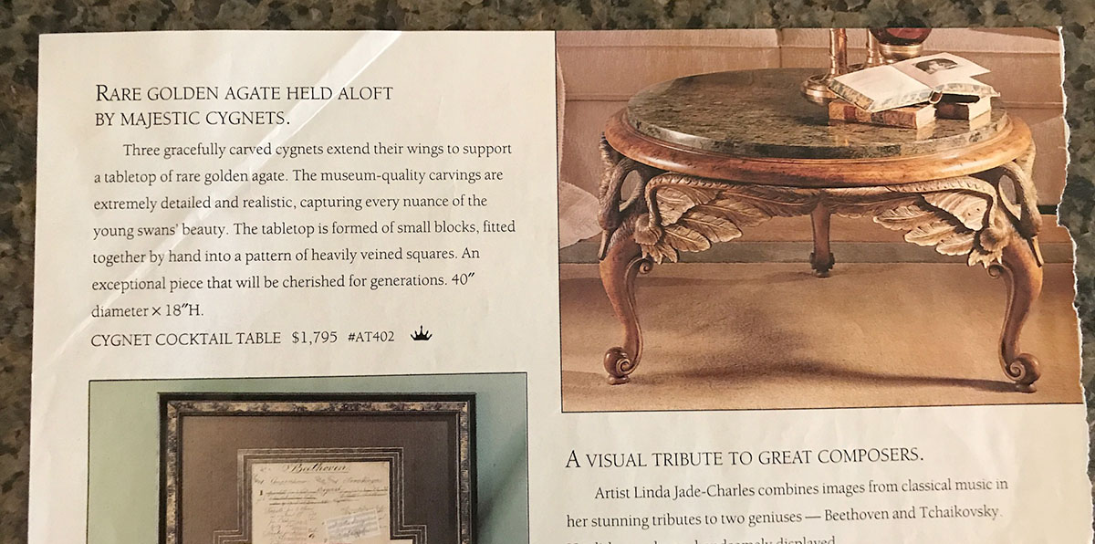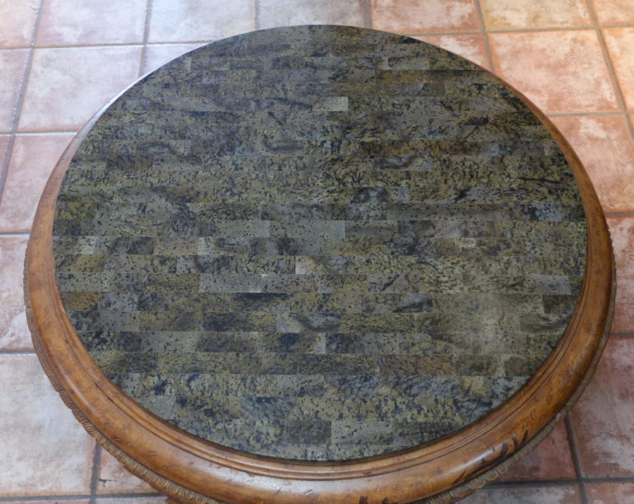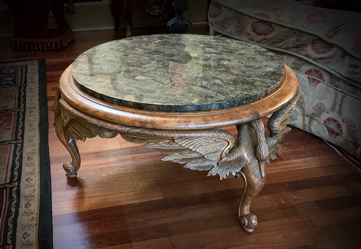 HORCHOW WINGED FIGURAL SWAN COFFEE TABLE: Round table with stone clad top, base with 3 carved wood figural wings swans making up the skirt and legs. Overall measures 21'' h. x 38 1/2''.