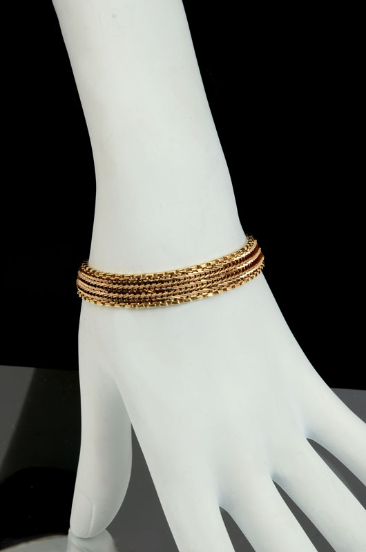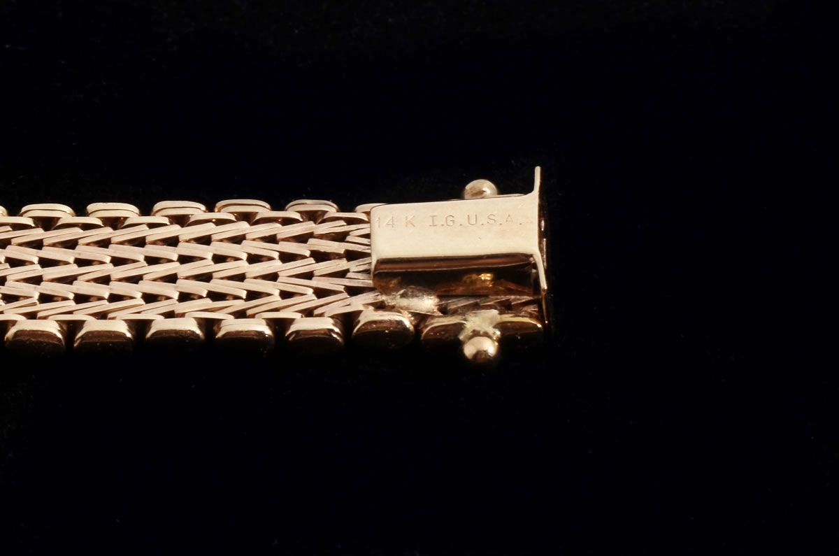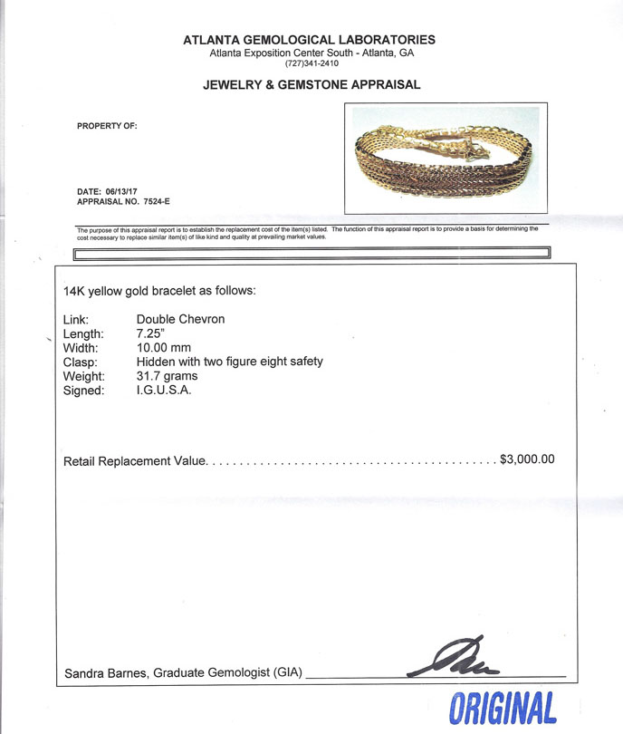 14K DOUBLE CHEVRON BRACELET: Beautifully crafted yellow gold bracelet feels good on your wrist signed by American maker IG. Measures approx 7''. Total weight is 31.5 grams. Sold with current Atlanta Gemological GIA graduate's appraisal for $3000.