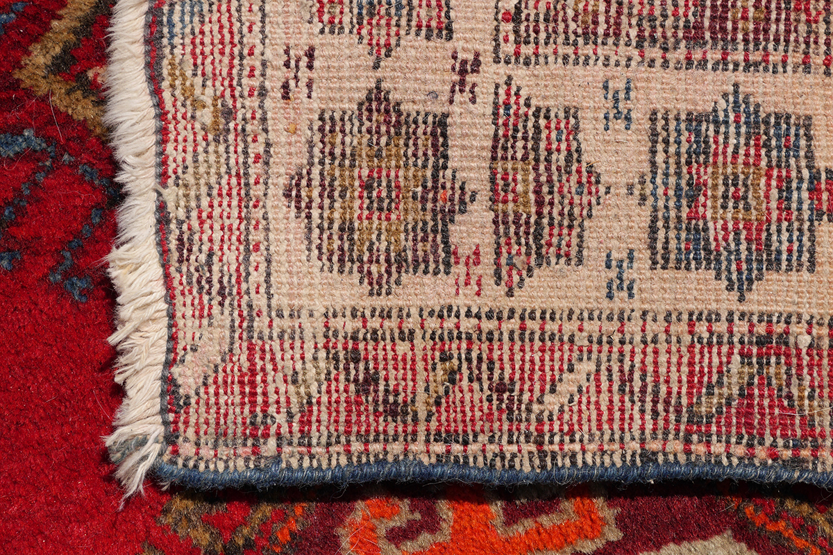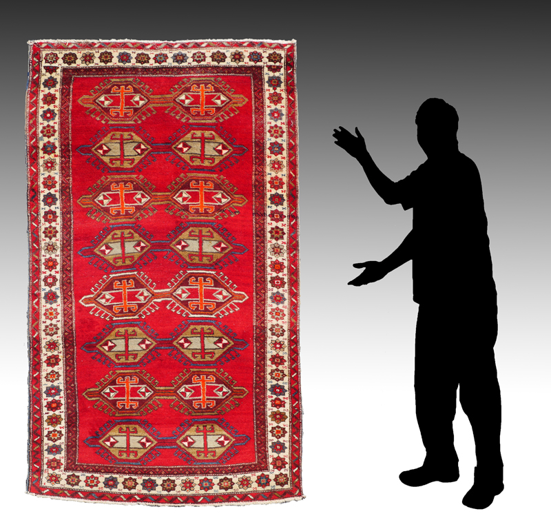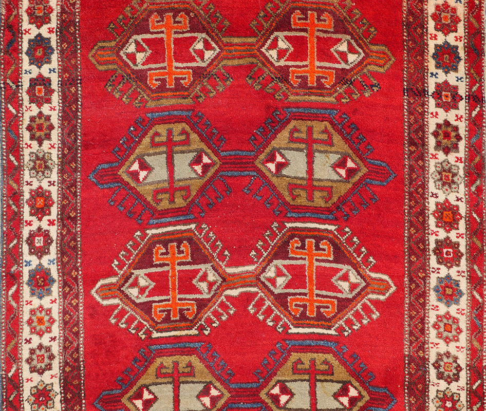 APPROX 15-35 YR OLD PERSIAN VILLAGE HAND KNOTTED WOOL RUNNER, 3'10'' X 7'5'': This lively rug has a bright red field with eight repeating two-part medallions that are outlined by latch-hooks. The colors of the medallions alternate and include red, white, green, orange, blue, and tan. The white ground center border makes the field stand out.