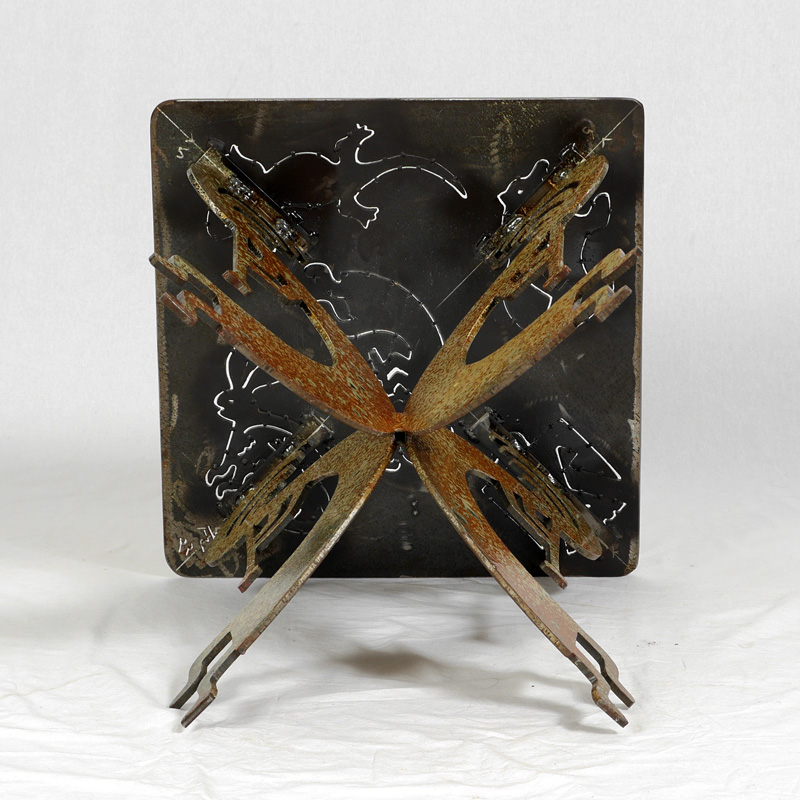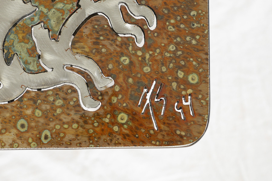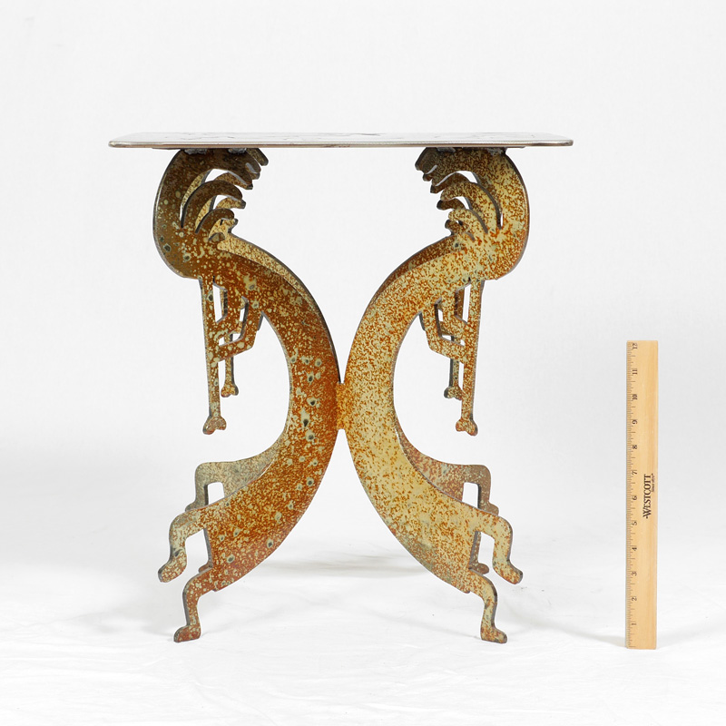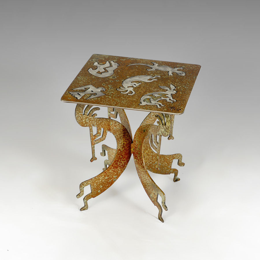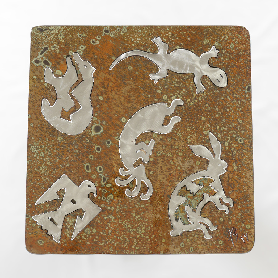 SOUTHWEST KOKOPELLI MOTIF METAL SIDE TABLE: Acid treated with brushed steel cut outs of figural kokopelli and fetish animals, figural kokopelli supports, signed 75(s) 94. 20 1/4'' x 18'' x 18''.