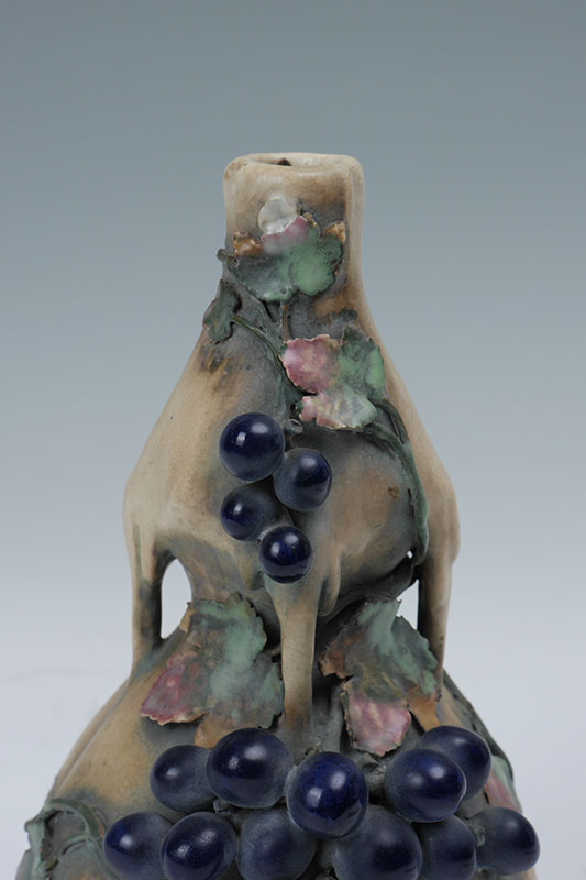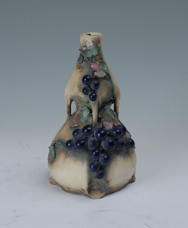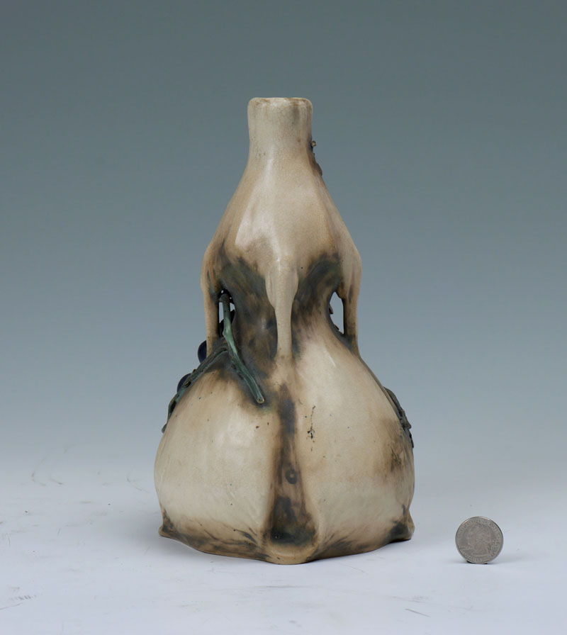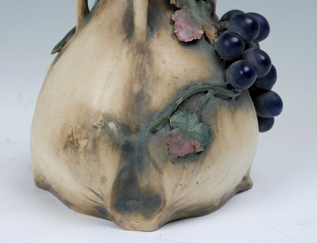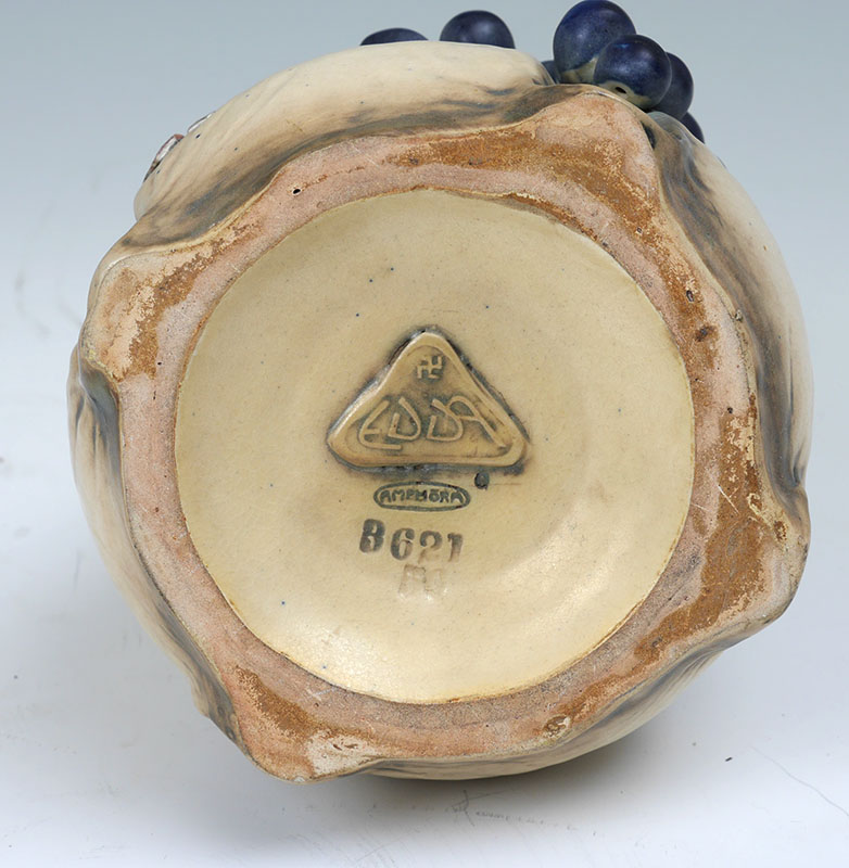 AMPHORA EDDA GRAPE VINE POTTERY VASE: Double gourd form with drips, applied grapes and vine decoration, impressed Amphora, 3621, FS, and raised Edda marks. Measures 9 1/2'' h. x 6 1/4''.