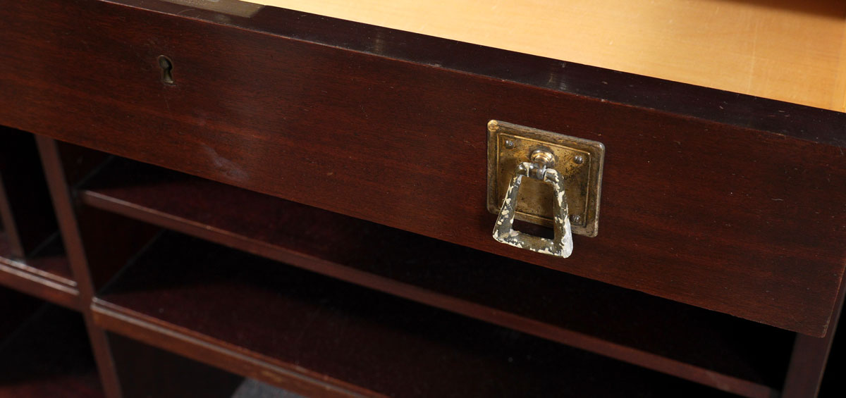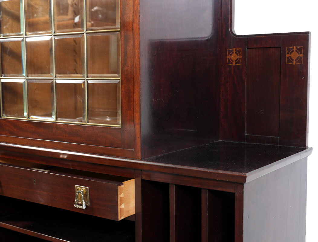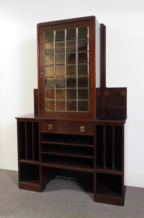 MISSION STYLE BEVELED GLASS SIDE CABINET: 28 light beveled glass panel top center with 2 wood shelves, backsplash wither side with inlaid medallions. Base with single drawer over 3 open shelves, flanked either side with vertical slats storage. Overall 70 1/2'' h. x 45 1/4'' x 16 1/4''.