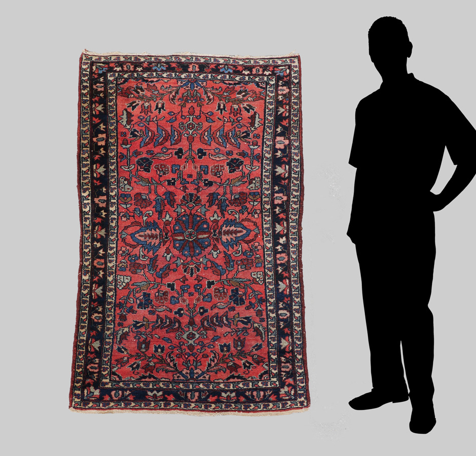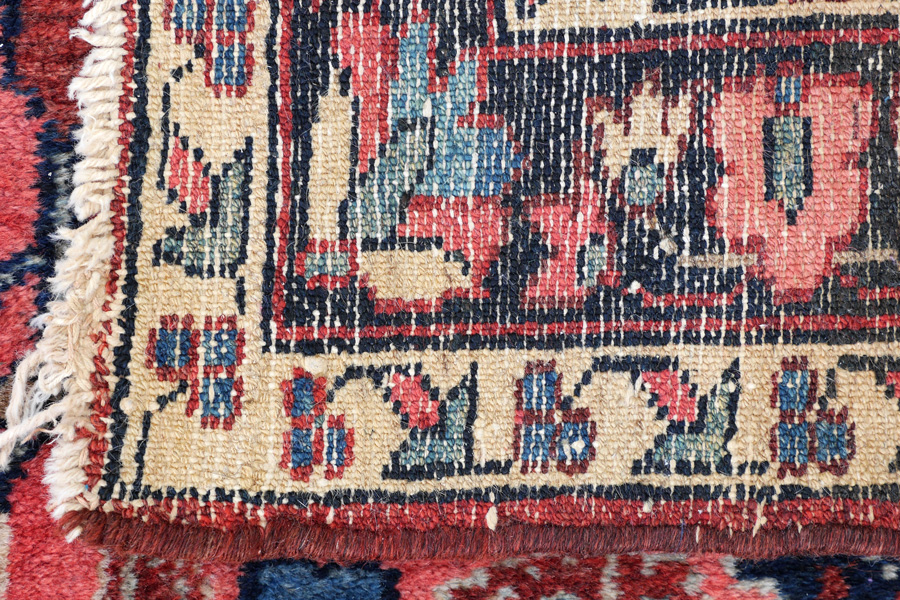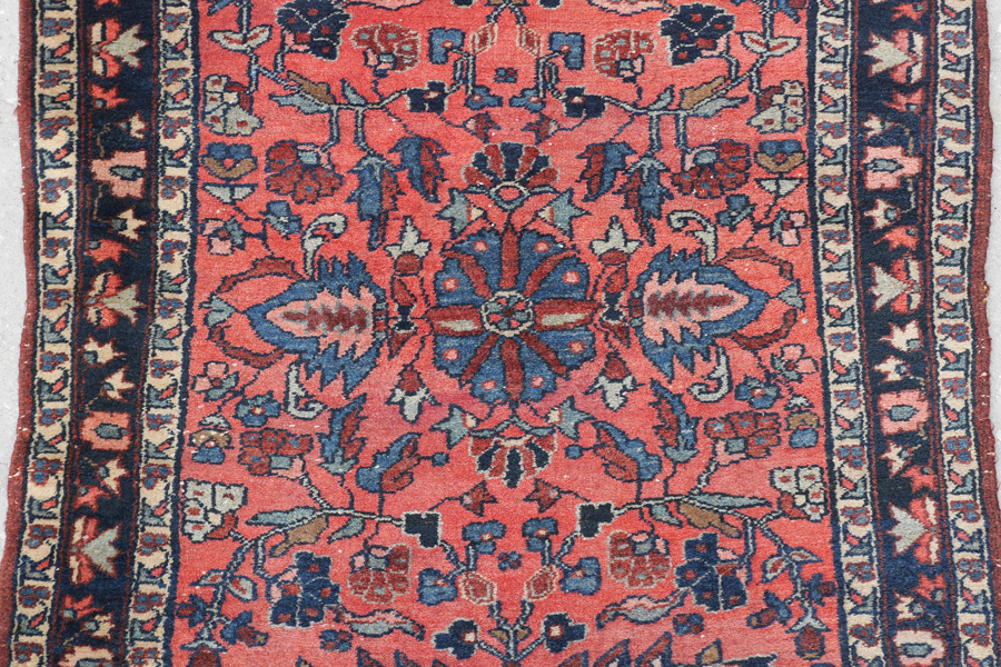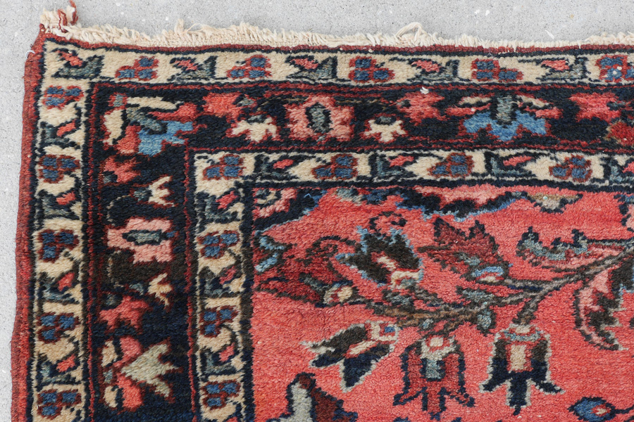 SEMI-ANTIQUE PERSIAN HAMADAN HAND KNOTTED WOOL RUG, 3'3'' X 5'1'': This cheerful village rug has a salmon pink field with a central small flower head medallion in medium blue, rust, and white. There are palmettes on each side instead of the ends and the whole of the medallion is outlined in dark blue. The rest of the field is covered with swags and sprays of leaves and flowers done in the same colors as those in the medallion. A dark blue main border with a white guard border on each side completes the rug.