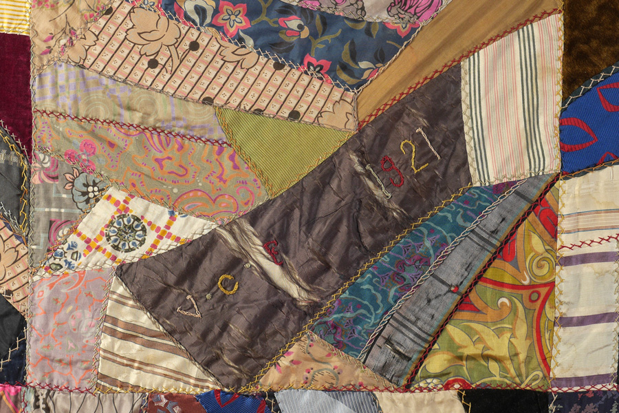 LARGE FRAMED CRAZY QUILT: Vibrant patterns and swatches, signed V. C. 1921 in center, quilt measures 70 1/2'' x 73'', framed 75 1/4'' x 75 1/4''.