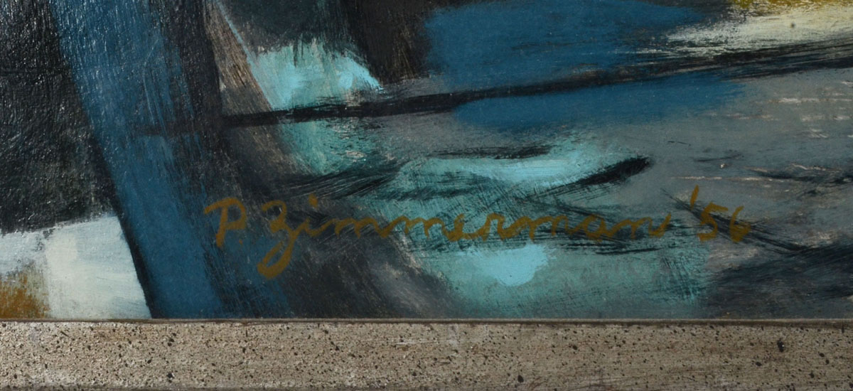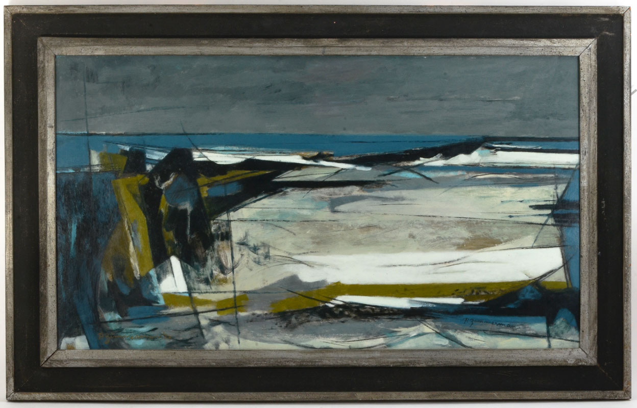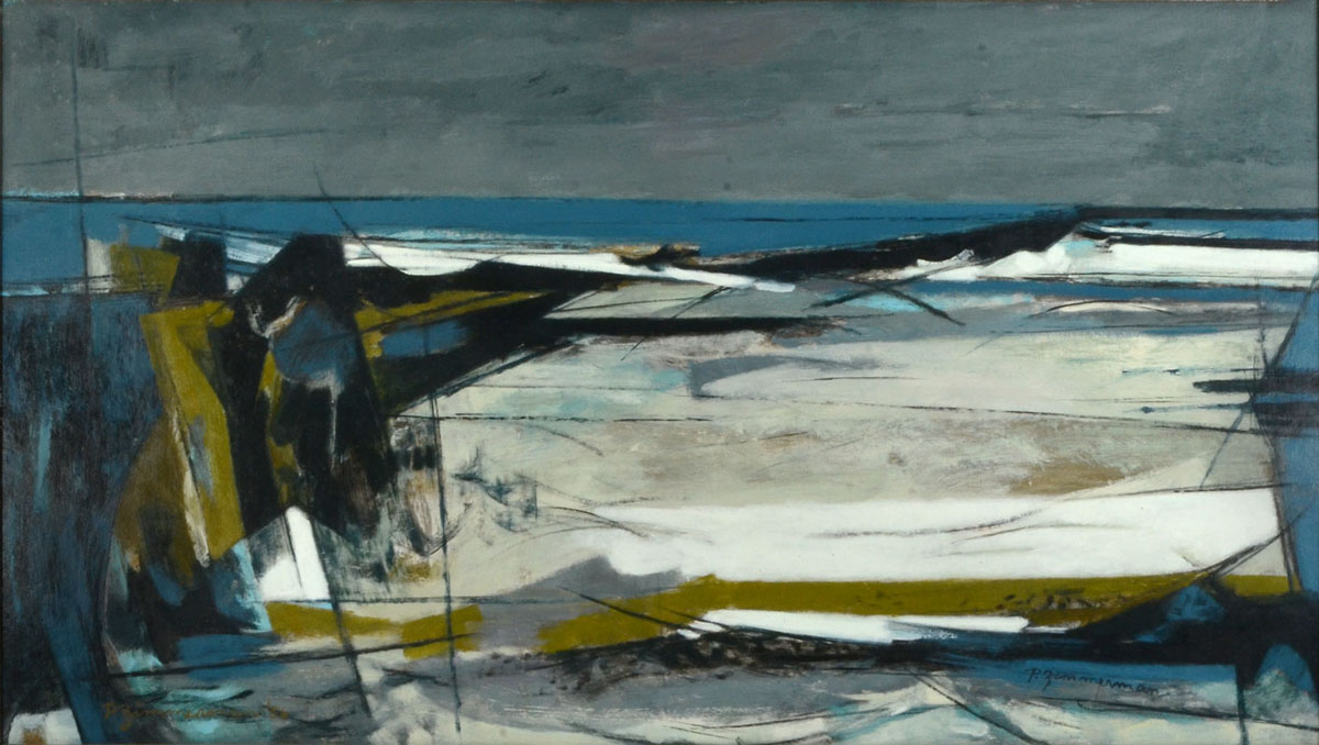 ZIMMERMAN, Paul, (American, 1921-2007): Abstract ''New England Coast'', Oil/Masonite, 21'' x 37'', signed lower right, titled verso, framed, 28.5'' x 44''.