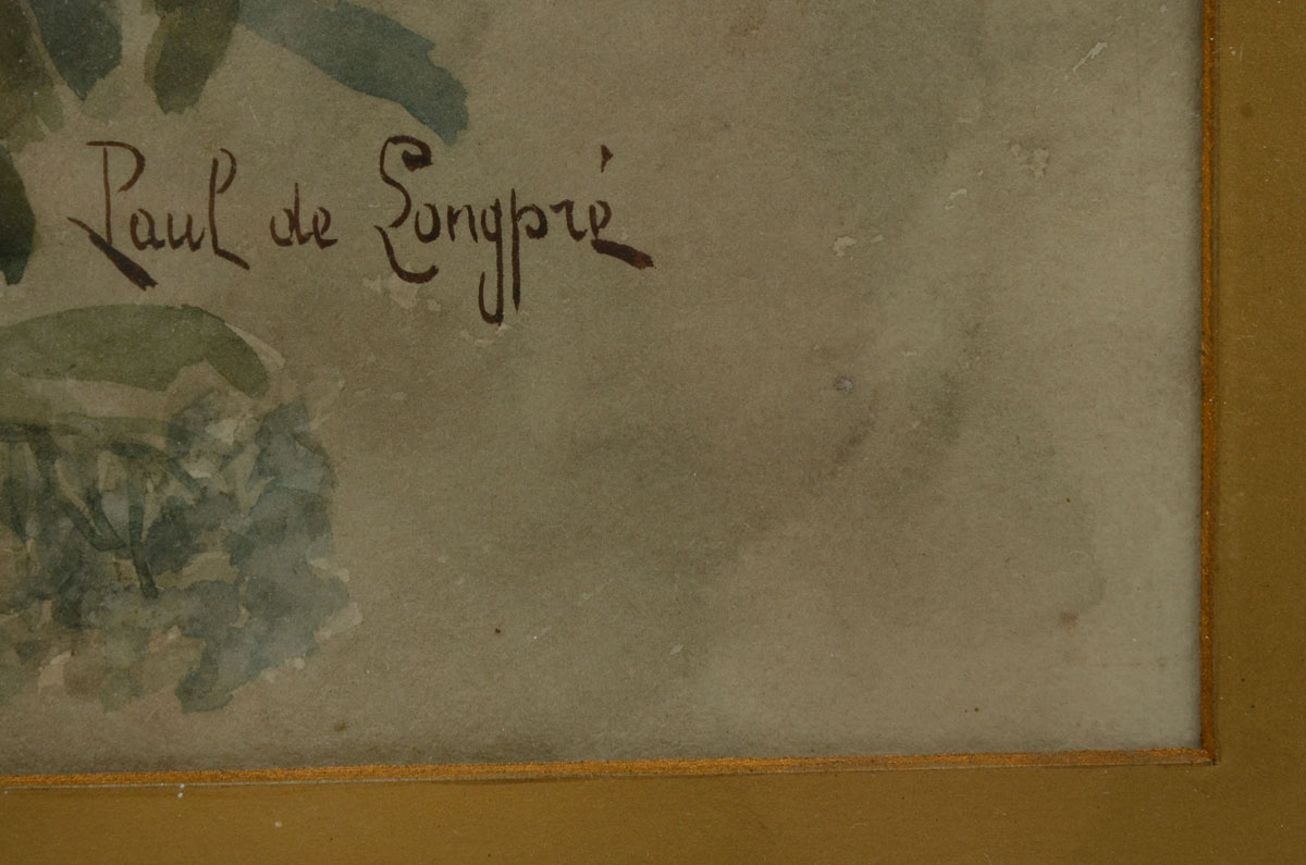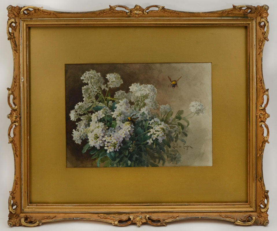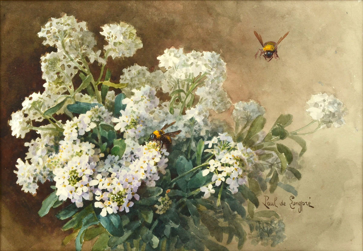 DELONGPRE, Paul, (American, 1855-1911): Still Life with Apple Blossom and Bumble Bees, Watercolor, sight size 9'' x 13'', signed lower right, period frame, 19.5'' x 23''.