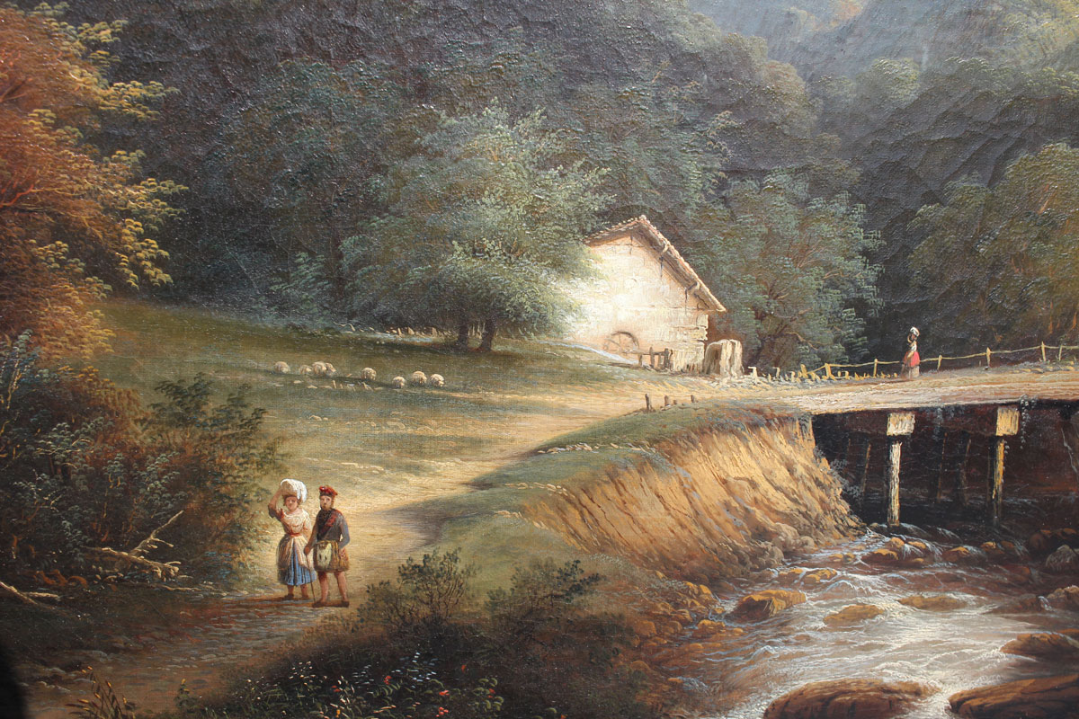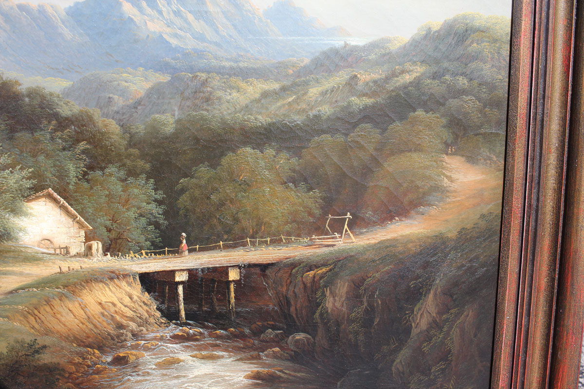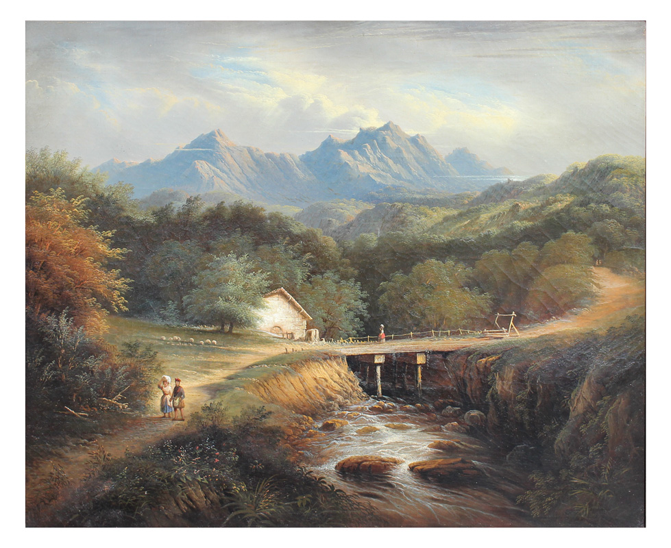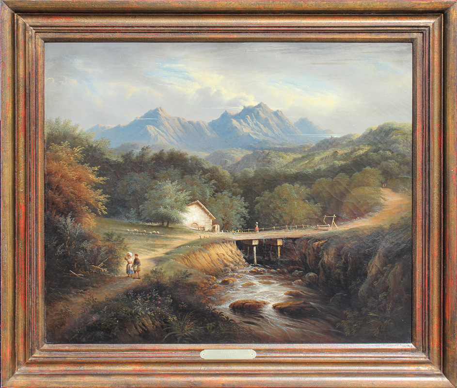 COATES, Edmund, (American, 1816-1871): Lush Mountain Vista Scene with Small Stream and Figures with a Mill and Sheep, Oil/Canvas, 25'' x 30'', signed lower left and dated 1860, contemporary frame, 31'' x 36''. Edmund Coates is known for his sea landscape paintings.